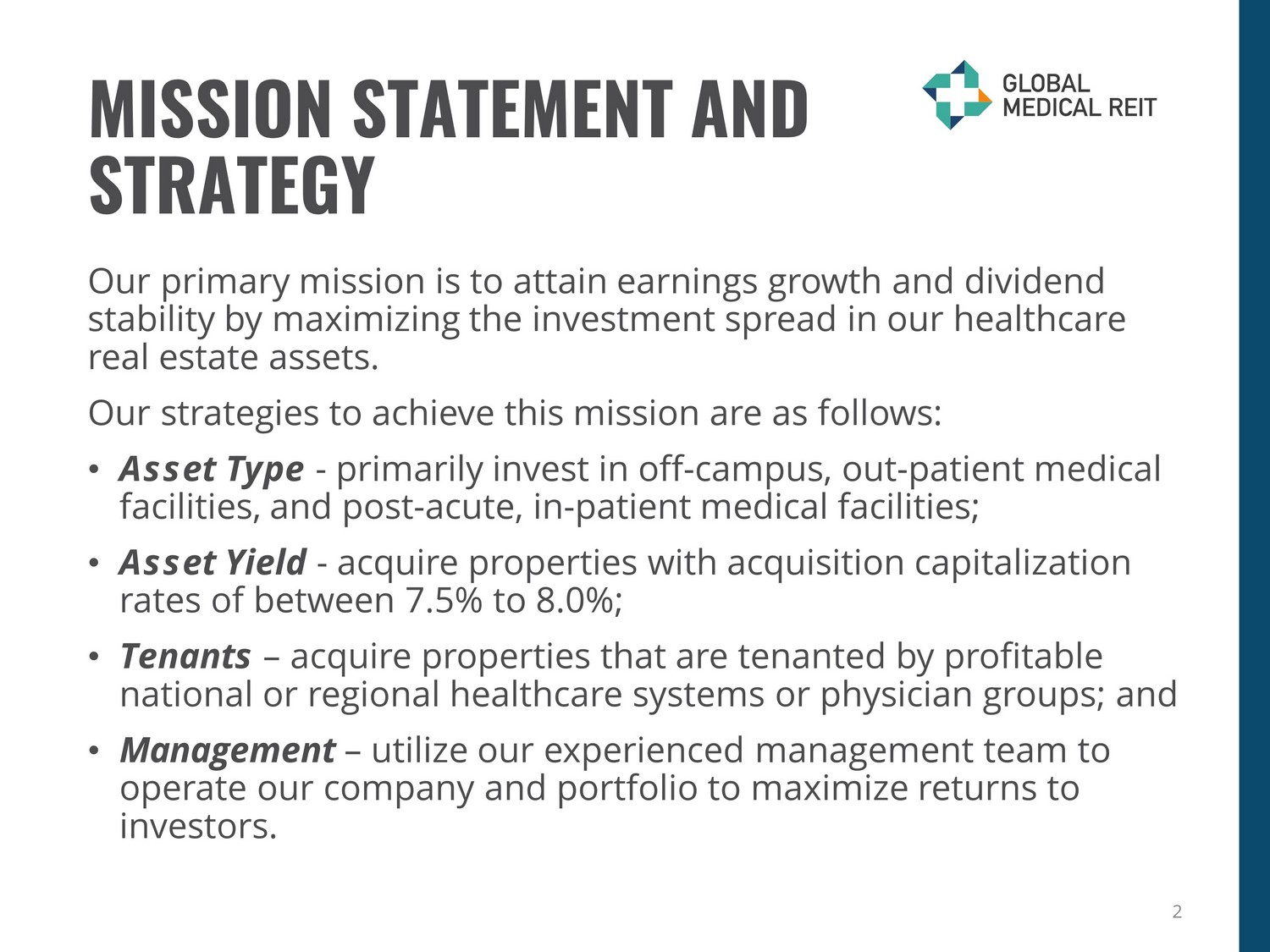 Our primary mission is to attain earnings growth and dividend stability by maximizing the investment spread in our healthcare real estate assets. Our strategies to achieve this mission are as follows: • Asset Type - primarily invest in off - campus, out - patient medical facilities, and post - acute, in - patient medical facilities; • Asset Yield - acquire properties with acquisition capitalization rates of between 7.5% to 8.0%; • Tenants – acquire properties that are tenanted by profitable national or regional healthcare systems or physician groups; and • Management – utilize our experienced management team to operate our company and portfolio to maximize returns to investors. 2 MISSION STATEMENT AND STRATEGY