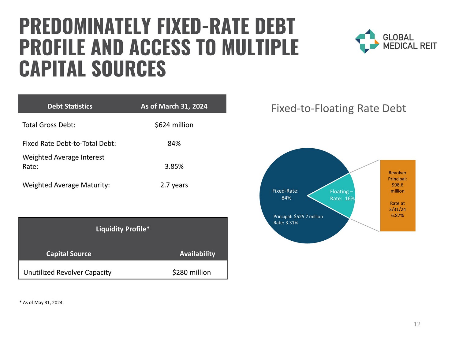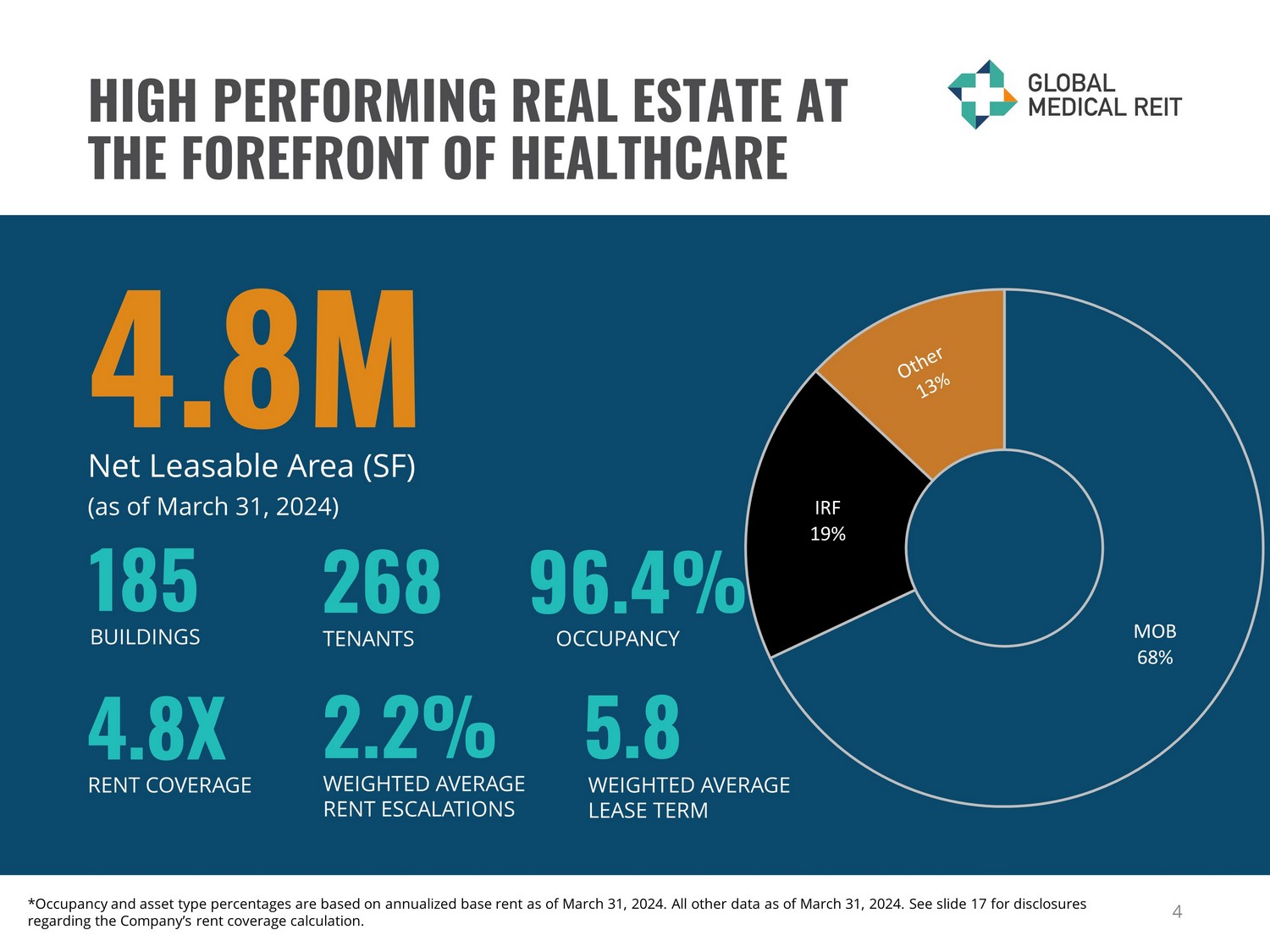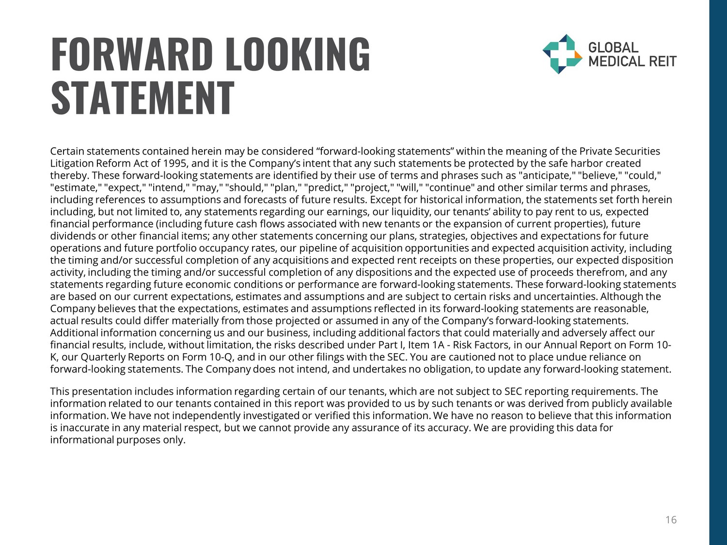 DISCLOSURES Rent Coverage Ratio and Other Matters For purposes of calculating our portfolio weighted - average EBITDARM coverage ratio (“Rent Coverage Ratio”), we excluded credit - rated tenants or their subsidiaries for which financial statements were either not available or not sufficiently detailed. Th ese ratios are based on latest available information only. Most tenant financial statements are unaudited and we have not independently verified any tenant financial information (audited or unaudited) and, therefore, we cannot assure you that such information i s accurate or complete. Certain other tenants (approximately 21% of our portfolio) are excluded from the calculation due to ( i ) lack of available financial information or (ii) small tenant size. Additionally, included within 21% of non - reporting tenants is Pipelin e Healthcare, LLC, which was sold to Heights Healthcare in October 2023 and is being operated under new management. Additionall y, our Rent Coverage Ratio adds back physician distributions and compensation. Management believes all adjustments are reasonabl e and necessary. Additional Information The information in this document should be read in conjunction with the Company’s Annual Report on Form 10 - K, Quarterly Reports on Form 10 - Q, Current Reports on Form 8 - K, and other information filed with, or furnished to, the SEC. You can access the Compan y’s reports and amendments to those reports filed or furnished to the SEC pursuant to Section 13(a) or 15(d) of the Exchange Act in the “Investor Relations” section on the Company’s website (www.globalmedicalreit.com) under “SEC Filings” as soon as reasonably practicable after they are filed with, or furnished to, the SEC. The information on or connected to the Company’s website is not , and shall not be deemed to be, a part of, or incorporated into, this Earnings Supplemental. You also can review these SEC filings an d other information by accessing the SEC’s website at http://www.sec.gov. Certain information contained in this package, including, but not limited to, information contained in our Top 10 tenant prof ile s is derived from publicly - available third - party sources. The Company has not independently verified this information and there can b e no assurance that such information is accurate or complete. 17