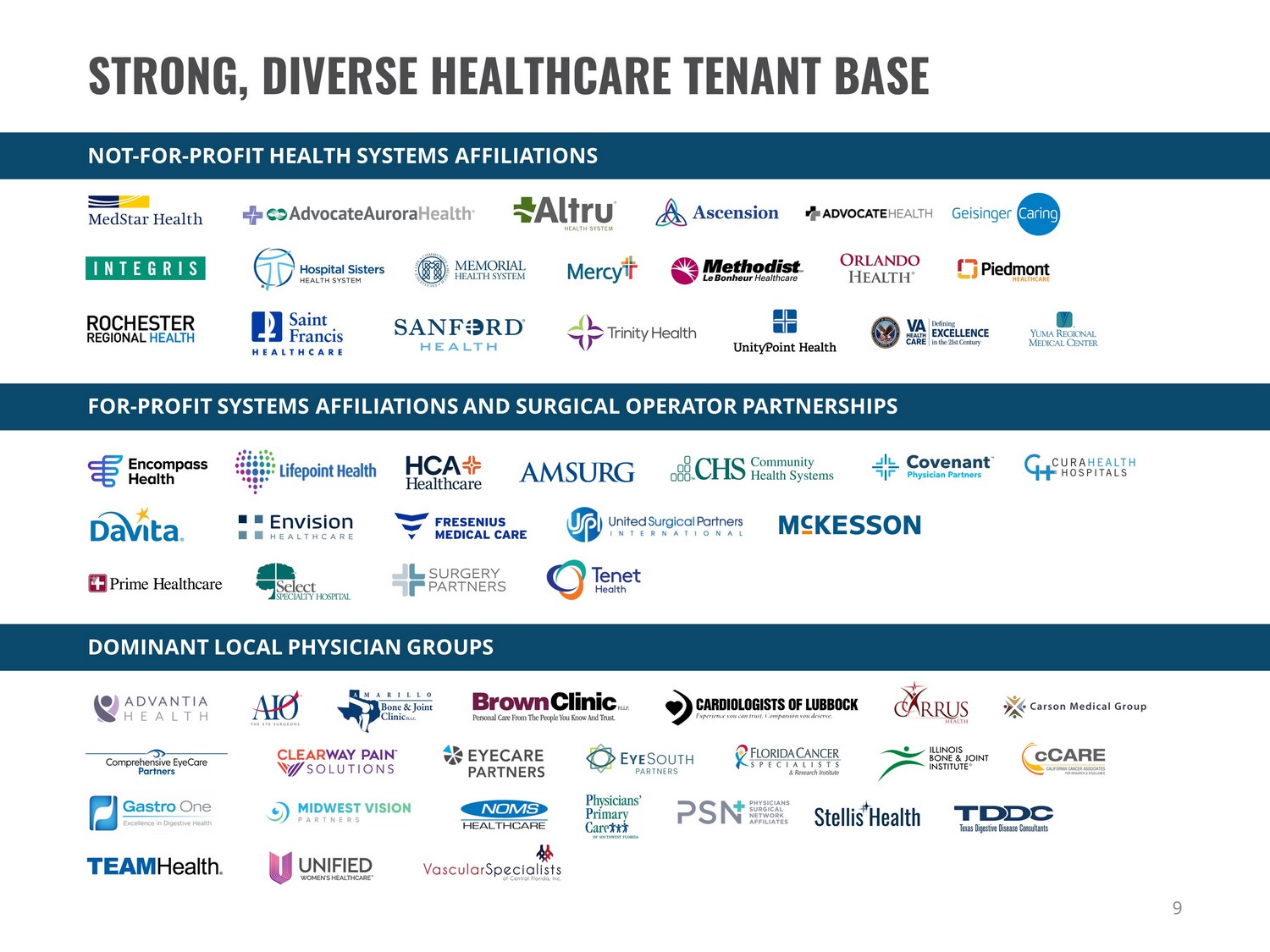 9 DOMINANT LOCAL PHYSICIAN GROUPS FOR - PROFIT SYSTEMS AFFILIATIONS AND SURGICAL OPERATOR PARTNERSHIPS STRONG, DIVERSE HEALTHCARE TENANT BASE NOT - FOR - PROFIT HEALTH SYSTEMS AFFILIATIONS