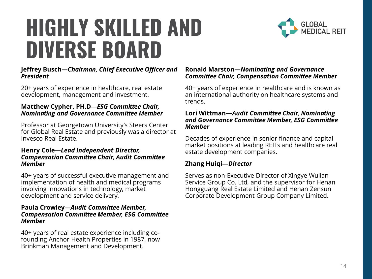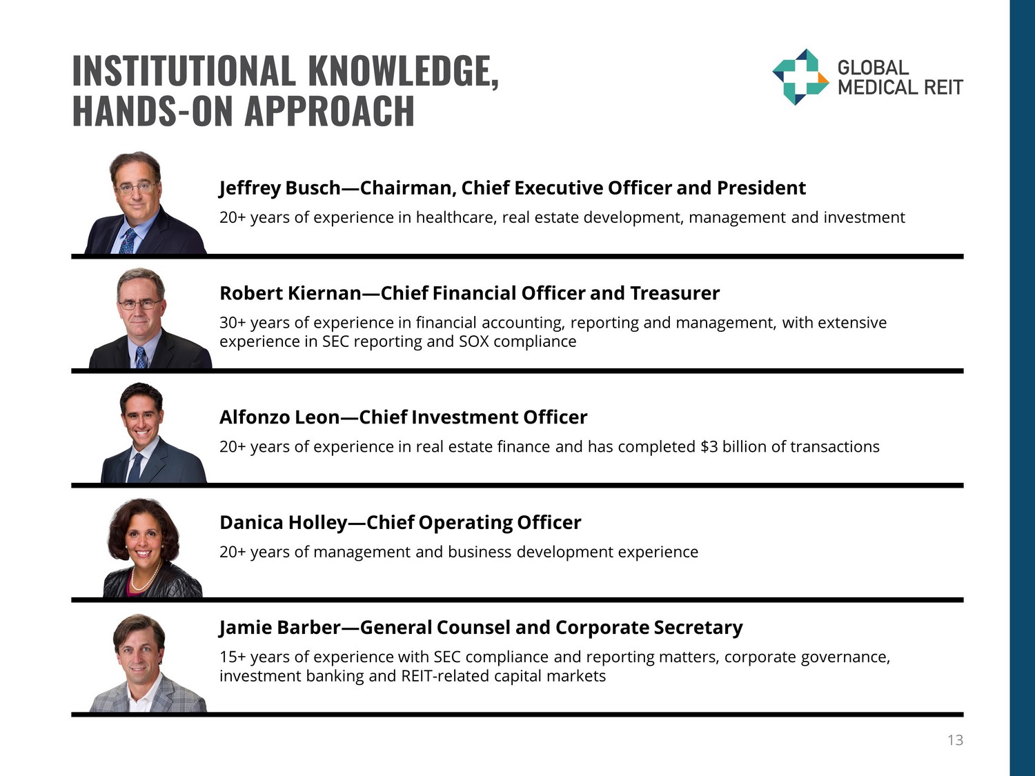 INSTITUTIONAL KNOWLEDGE, HANDS - ON APPROACH Jeffrey Busch — Chairman, Chief Executive Officer and President 20+ years of experience in healthcare, real estate development, management and investment Robert Kiernan — Chief Financial Officer and Treasurer 30+ years of experience in financial accounting, reporting and management, with extensive experience in SEC reporting and SOX compliance Alfonzo Leon — Chief Investment Officer 20+ years of experience in real estate finance and has completed $3 billion of transactions Danica Holley — Chief Operating Officer 20+ years of management and business development experience Jamie Barber — General Counsel and Corporate Secretary 15+ years of experience with SEC compliance and reporting matters, corporate governance, investment banking and REIT - related capital markets 13