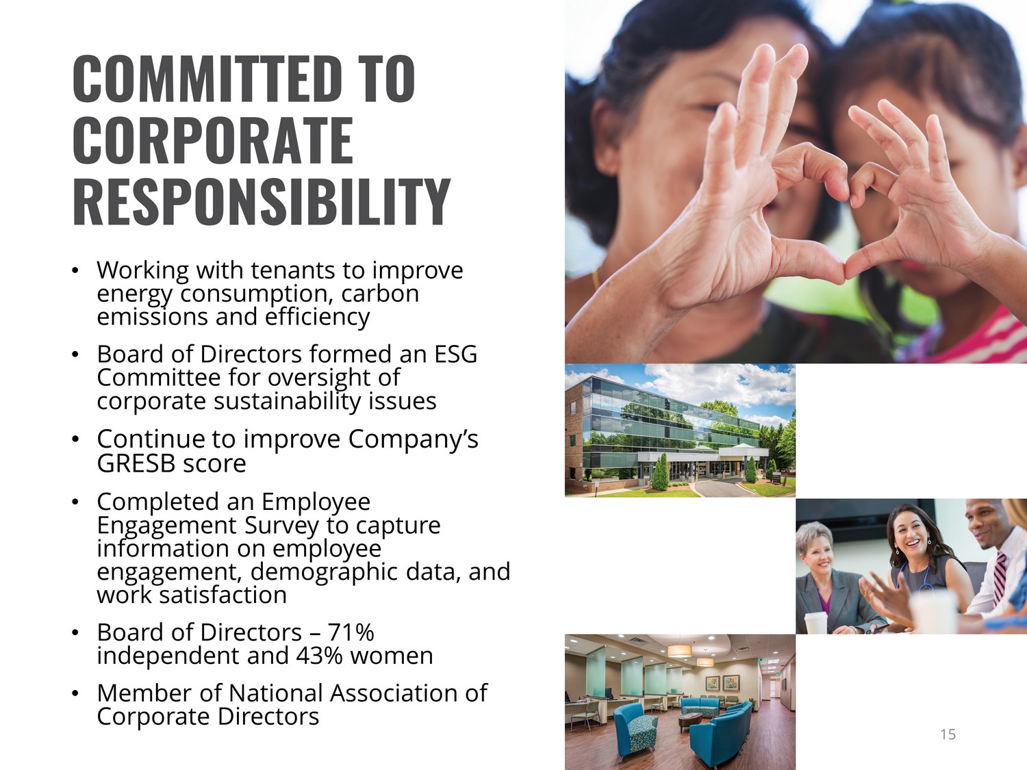 HIGHLY SKILLED AND DIVERSE BOARD 14 Jeffrey Busch — Chairman, Chief Executive Officer and President 20+ years of experience in healthcare, real estate development, management and investment. Matthew Cypher, PH.D — ESG Committee Chair, Nominating and Governance Committee Member Professor at Georgetown University’s Steers Center for Global Real Estate and previously was a director at Invesco Real Estate. Henry Cole — Lead Independent Director, Compensation Committee Chair, Audit Committee Member 40+ years of successful executive management and implementation of health and medical programs involving innovations in technology, market development and service delivery. Paula Crowley — Audit Committee Member, Compensation Committee Member, ESG Committee Member 40+ years of real estate experience including co - founding Anchor Health Properties in 1987, now Brinkman Management and Development. Ronald Marston — Nominating and Governance Committee Chair, Compensation Committee Member 40+ years of experience in healthcare and is known as an international authority on healthcare systems and trends. Lori Wittman — Audit Committee Chair, Nominating and Governance Committee Member, ESG Committee Member Decades of experience in senior finance and capital market positions at leading REITs and healthcare real estate development companies. Zhang Huiqi — Director Serves as non - Executive Director of Xingye Wulian Service Group Co. Ltd, and the supervisor for Henan Hongguang Real Estate Limited and Henan Zensun Corporate Development Group Company Limited.
