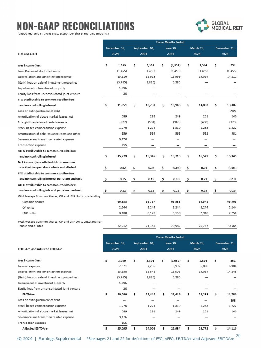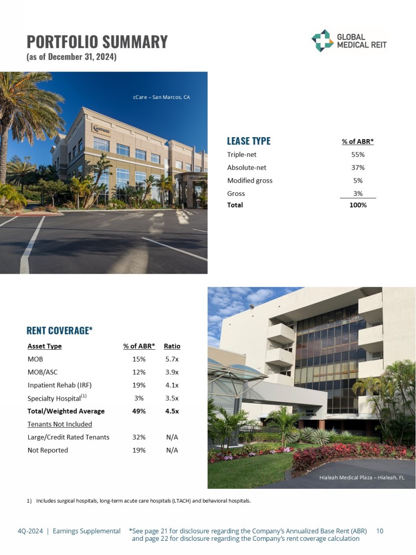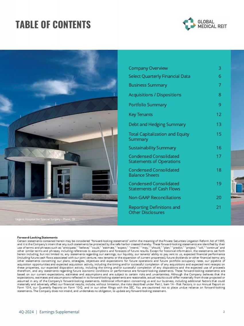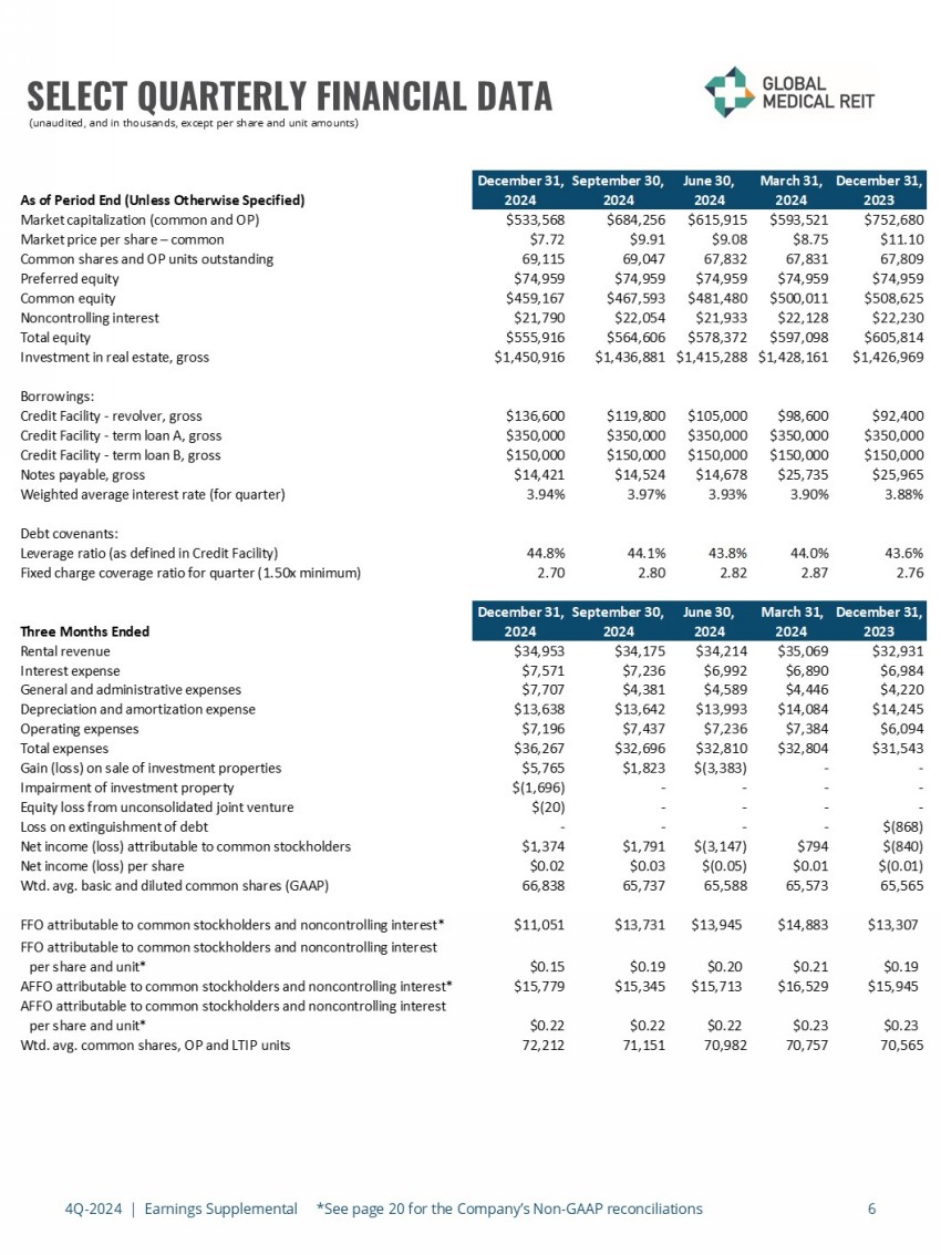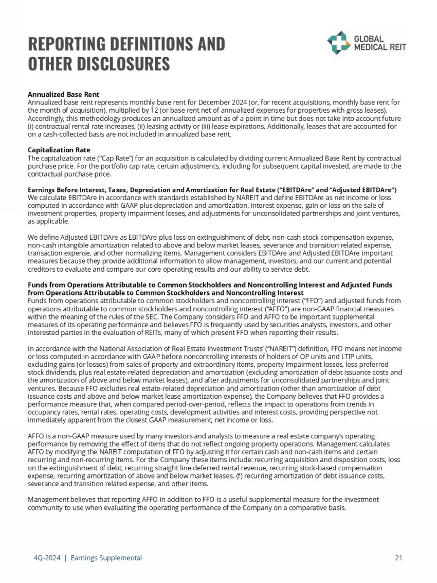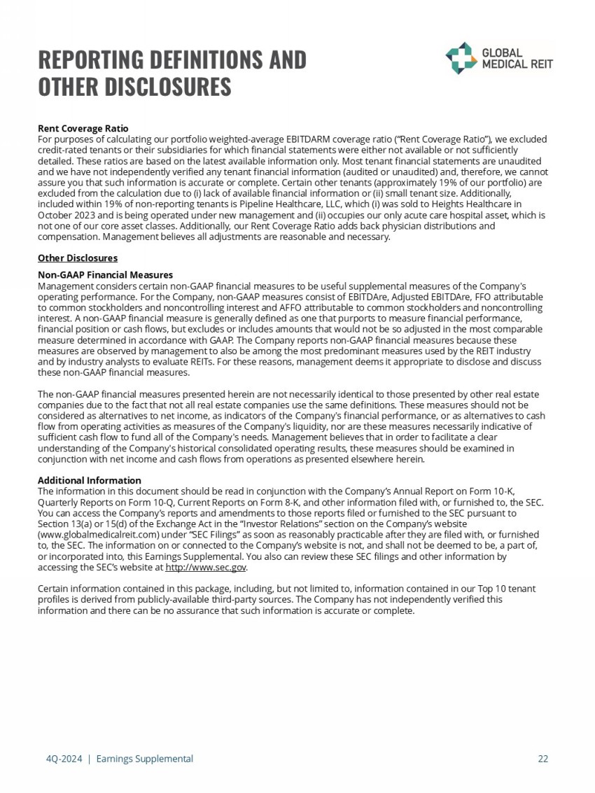 4Q - 2024 | Earnings Supplemental 22 REPORTING DEFINITIONS AND OTHER DISCLOSURES Rent Coverage Ratio For purposes of calculating our portfolio weighted - average EBITDARM coverage ratio (“Rent Coverage Ratio”), we excluded credit - rated tenants or their subsidiaries for which financial statements were either not available or not sufficiently detailed. These ratios are based on the latest available information only. Most tenant financial statements are unaudited and we have not independently verified any tenant financial information (audited or unaudited) and, therefore, we cannot assure you that such information is accurate or complete. Certain other tenants (approximately 19 % of our portfolio) are excluded from the calculation due to (i) lack of available financial information or (ii) small tenant size. Additionally, included within 19% of non - reporting tenants is Pipeline Healthcare, LLC, which (i) was sold to Heights Healthcare in October 2023 and is being operated under new management and (ii) occupies our only acute care hospital asset, which is not one of our core asset classes. Additionally, our Rent Coverage Ratio adds back physician distributions and compensation. Management believes all adjustments are reasonable and necessary. Other Disclosures Non - GAAP Financial Measures Management considers certain non - GAAP financial measures to be useful supplemental measures of the Company's operating performance. For the Company, non - GAAP measures consist of EBITDAre, Adjusted EBITDAre, FFO attributable to common stockholders and noncontrolling interest and AFFO attributable to common stockholders and noncontrolling interest. A non - GAAP financial measure is generally defined as one that purports to measure financial performance, financial position or cash flows, but excludes or includes amounts that would not be so adjusted in the most comparable measure determined in accordance with GAAP. The Company reports non - GAAP financial measures because these measures are observed by management to also be among the most predominant measures used by the REIT industry and by industry analysts to evaluate REITs. For these reasons, management deems it appropriate to disclose and discuss these non - GAAP financial measures. The non - GAAP financial measures presented herein are not necessarily identical to those presented by other real estate companies due to the fact that not all real estate companies use the same definitions. These measures should not be considered as alternatives to net income, as indicators of the Company's financial performance, or as alternatives to cash flow from operating activities as measures of the Company's liquidity, nor are these measures necessarily indicative of sufficient cash flow to fund all of the Company's needs. Management believes that in order to facilitate a clear understanding of the Company's historical consolidated operating results, these measures should be examined in conjunction with net income and cash flows from operations as presented elsewhere herein. Additional Information The information in this document should be read in conjunction with the Company’s Annual Report on Form 10 - K, Quarterly Reports on Form 10 - Q, Current Reports on Form 8 - K, and other information filed with, or furnished to, the SEC. You can access the Company’s reports and amendments to those reports filed or furnished to the SEC pursuant to Section 13(a) or 15(d) of the Exchange Act in the “Investor Relations” section on the Company’s website (www.globalmedicalreit.com) under “SEC Filings” as soon as reasonably practicable after they are filed with, or furnished to, the SEC. The information on or connected to the Company’s website is not, and shall not be deemed to be, a part of, or incorporated into, this Earnings Supplemental. You also can review these SEC filings and other information by accessing the SEC’s website at http://www.sec.gov . Certain information contained in this package, including, but not limited to, information contained in our Top 10 tenant profiles is derived from publicly - available third - party sources. The Company has not independently verified this information and there can be no assurance that such information is accurate or complete.