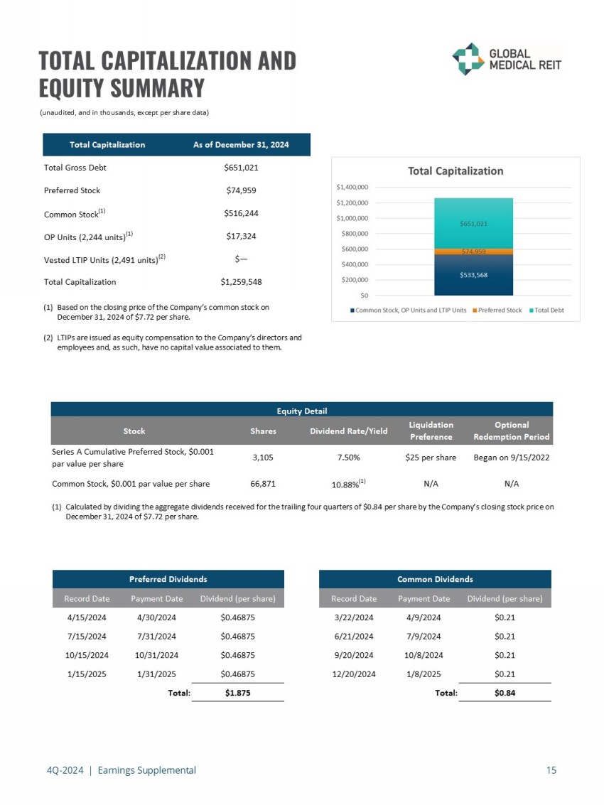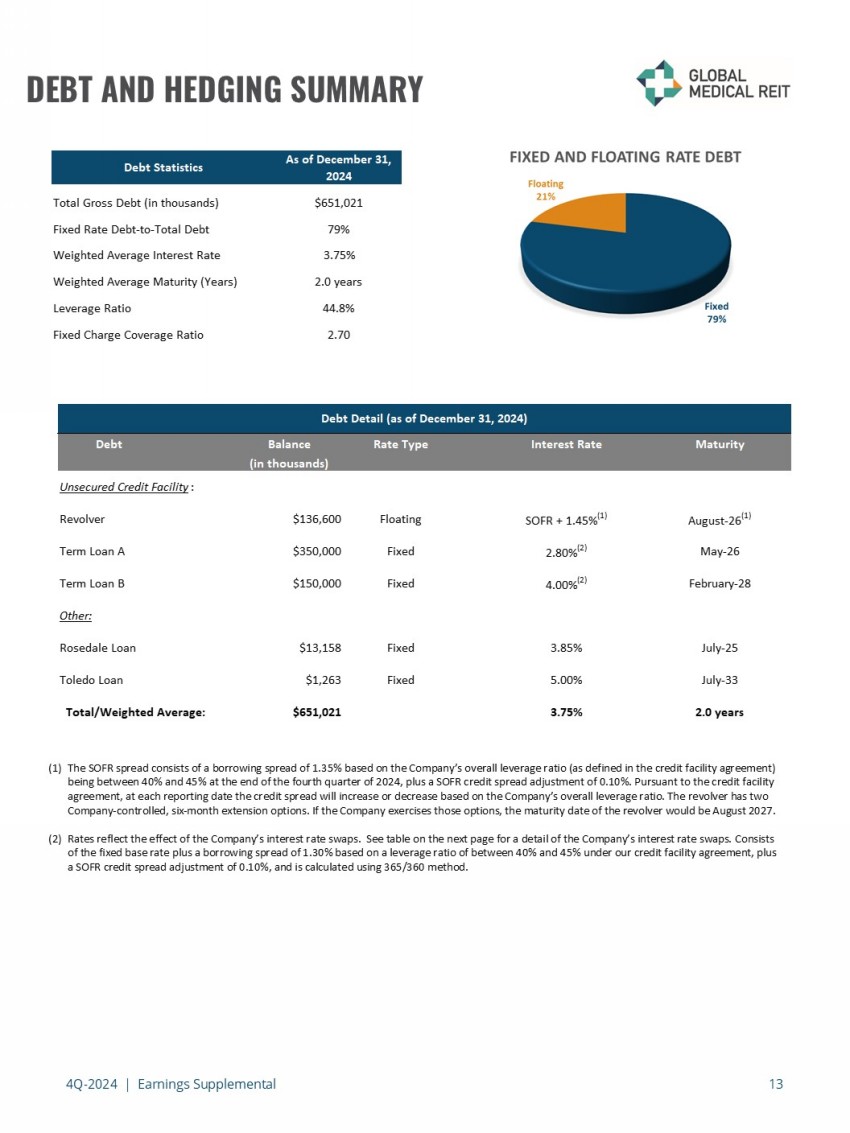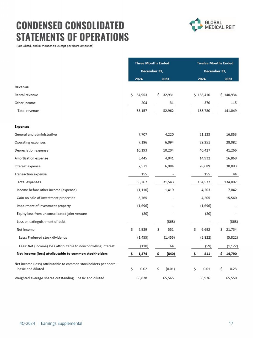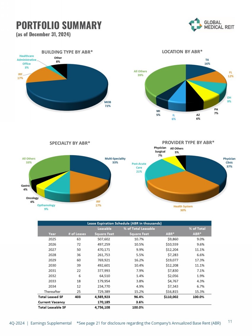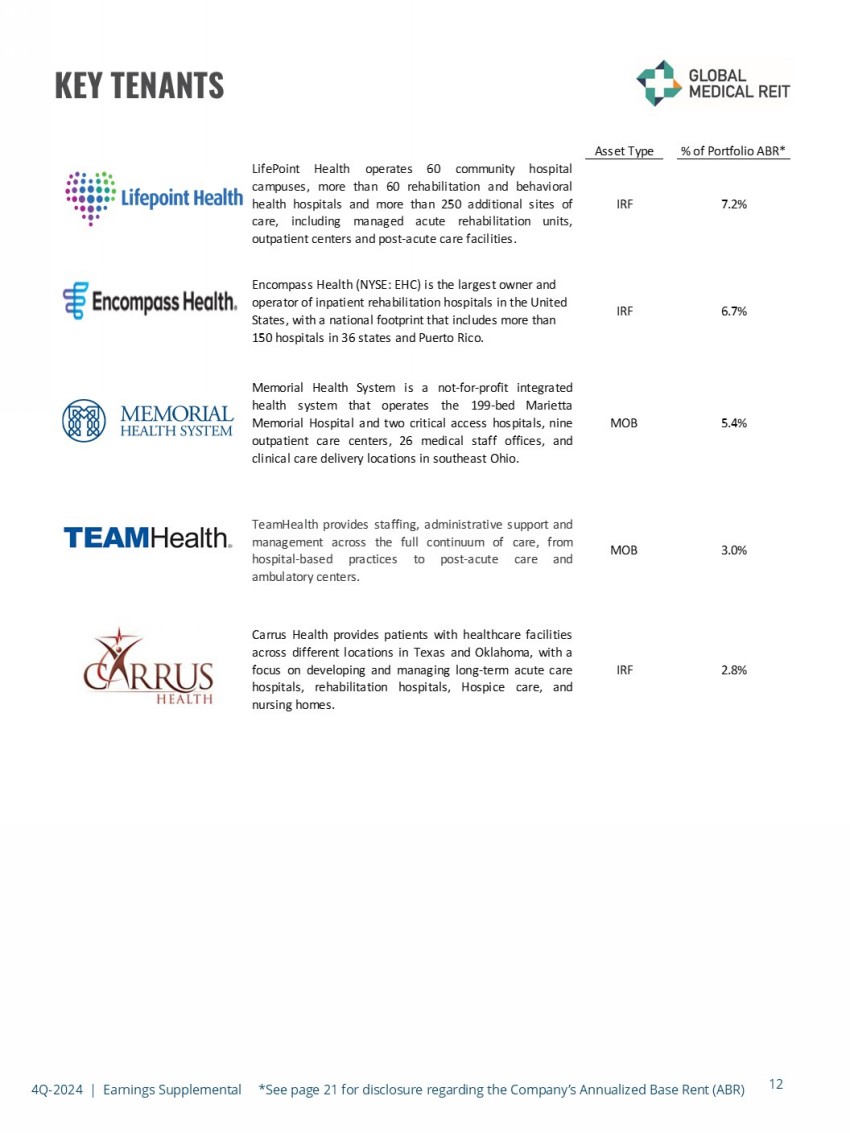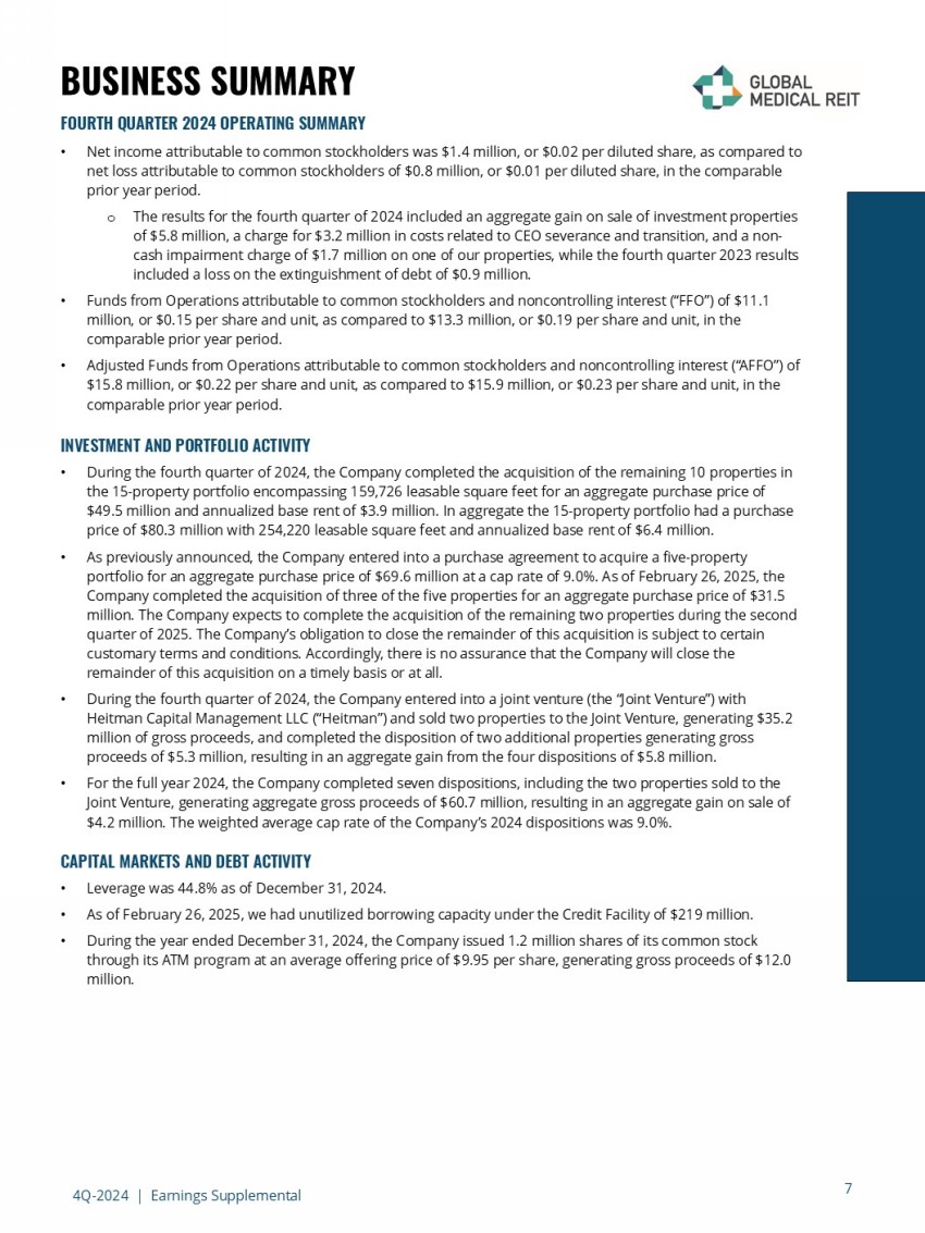 4Q - 2024 | Earnings Supplemental 22 REPORTING DEFINITIONS AND OTHER DISCLOSURES Rent Coverage Ratio For purposes of calculating our portfolio weighted - average EBITDARM coverage ratio (“Rent Coverage Ratio”), we excluded credit - rated tenants or their subsidiaries for which financial statements were either not available or not sufficiently detailed. These ratios are based on the latest available information only. Most tenant financial statements are unaudited and we have not independently verified any tenant financial information (audited or unaudited) and, therefore, we cannot assure you that such information is accurate or complete. Certain other tenants (approximately 19 % of our portfolio) are excluded from the calculation due to (i) lack of available financial information or (ii) small tenant size. Additionally, included within 19% of non - reporting tenants is Pipeline Healthcare, LLC, which (i) was sold to Heights Healthcare in October 2023 and is being operated under new management and (ii) occupies our only acute care hospital asset, which is not one of our core asset classes. Additionally, our Rent Coverage Ratio adds back physician distributions and compensation. Management believes all adjustments are reasonable and necessary. Other Disclosures Non - GAAP Financial Measures Management considers certain non - GAAP financial measures to be useful supplemental measures of the Company's operating performance. For the Company, non - GAAP measures consist of EBITDAre, Adjusted EBITDAre, FFO attributable to common stockholders and noncontrolling interest and AFFO attributable to common stockholders and noncontrolling interest. A non - GAAP financial measure is generally defined as one that purports to measure financial performance, financial position or cash flows, but excludes or includes amounts that would not be so adjusted in the most comparable measure determined in accordance with GAAP. The Company reports non - GAAP financial measures because these measures are observed by management to also be among the most predominant measures used by the REIT industry and by industry analysts to evaluate REITs. For these reasons, management deems it appropriate to disclose and discuss these non - GAAP financial measures. The non - GAAP financial measures presented herein are not necessarily identical to those presented by other real estate companies due to the fact that not all real estate companies use the same definitions. These measures should not be considered as alternatives to net income, as indicators of the Company's financial performance, or as alternatives to cash flow from operating activities as measures of the Company's liquidity, nor are these measures necessarily indicative of sufficient cash flow to fund all of the Company's needs. Management believes that in order to facilitate a clear understanding of the Company's historical consolidated operating results, these measures should be examined in conjunction with net income and cash flows from operations as presented elsewhere herein. Additional Information The information in this document should be read in conjunction with the Company’s Annual Report on Form 10 - K, Quarterly Reports on Form 10 - Q, Current Reports on Form 8 - K, and other information filed with, or furnished to, the SEC. You can access the Company’s reports and amendments to those reports filed or furnished to the SEC pursuant to Section 13(a) or 15(d) of the Exchange Act in the “Investor Relations” section on the Company’s website (www.globalmedicalreit.com) under “SEC Filings” as soon as reasonably practicable after they are filed with, or furnished to, the SEC. The information on or connected to the Company’s website is not, and shall not be deemed to be, a part of, or incorporated into, this Earnings Supplemental. You also can review these SEC filings and other information by accessing the SEC’s website at http://www.sec.gov . Certain information contained in this package, including, but not limited to, information contained in our Top 10 tenant profiles is derived from publicly - available third - party sources. The Company has not independently verified this information and there can be no assurance that such information is accurate or complete.