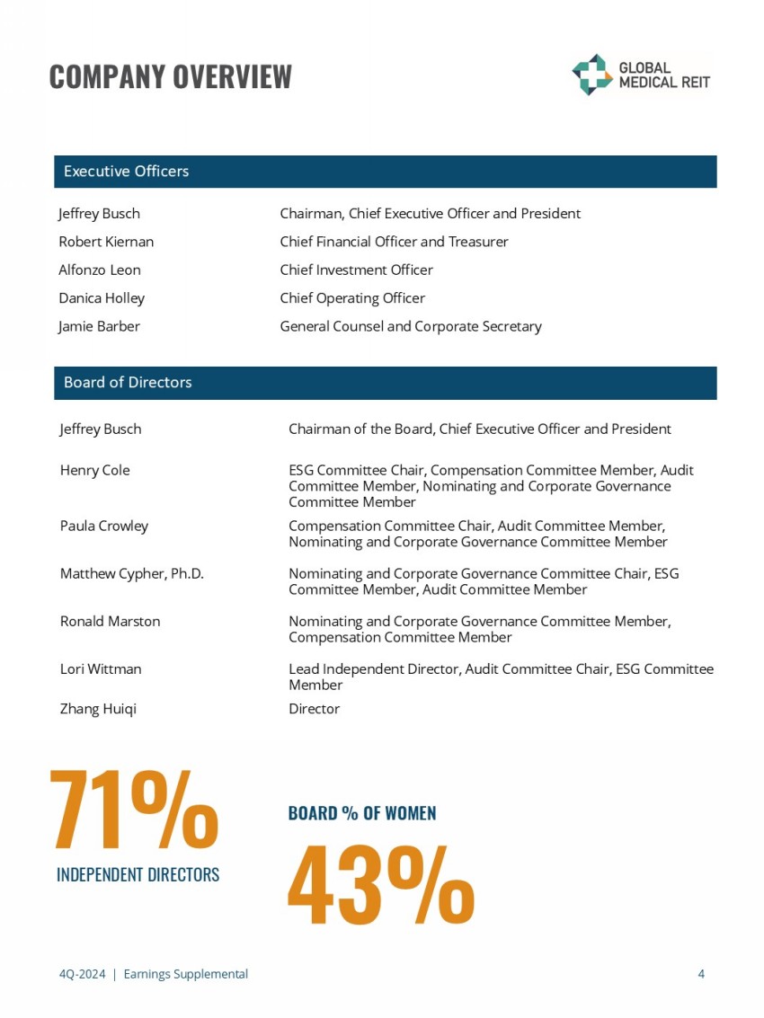 3 4Q - 2024 | Earnings Supplemental *See page 22 for disclosure regarding the Company’s rent coverage calculation COMPANY OVERVIEW GLOBAL MEDICAL REIT INC. (GMRE) IS A NET - LEASE MEDICAL REAL ESTATE INVESTMENT TRUST (REIT) THAT ACQUIRES HEALTHCARE FACILITIES AND LEASES THOSE FACILITIES TO PHYSICIAN GROUPS AND REGIONAL AND NATIONAL HEALTHCARE SYSTEMS. PORTFOLIO SNAPSHOT (as of December 31, 2024) Blue Sky Vision – Grand Rapids, MI Gross Investment in Real Estate (billions) $1.5 Number of Buildings 190 Number of States 37 Weighted Average Portfolio Cap Rate 7.8% % of Health System or Other Affiliated Tenants 90% Weighted Average Lease Term (years) 5.6 Leased Occupancy 96.4% Portfolio Rent Coverage* 4.5x