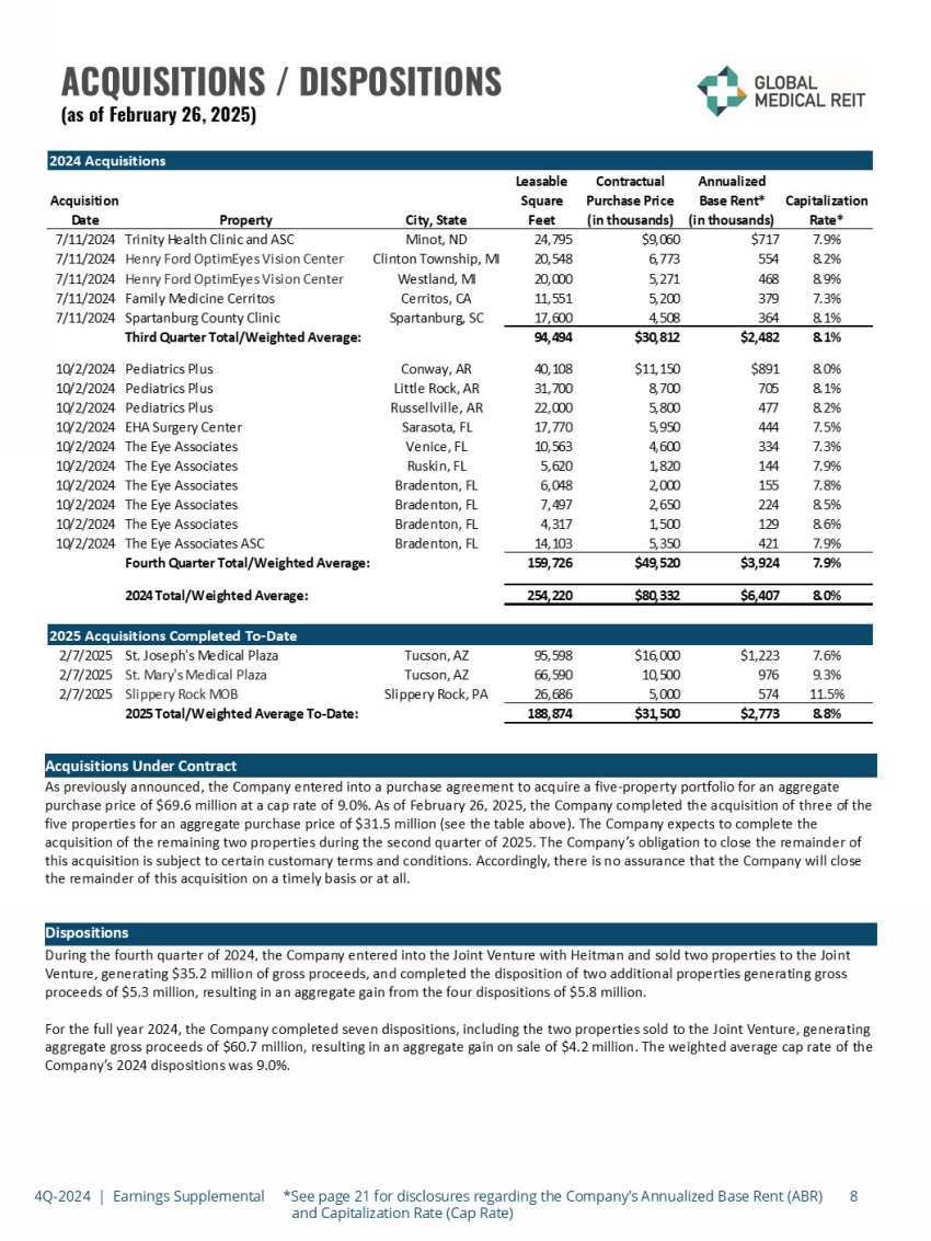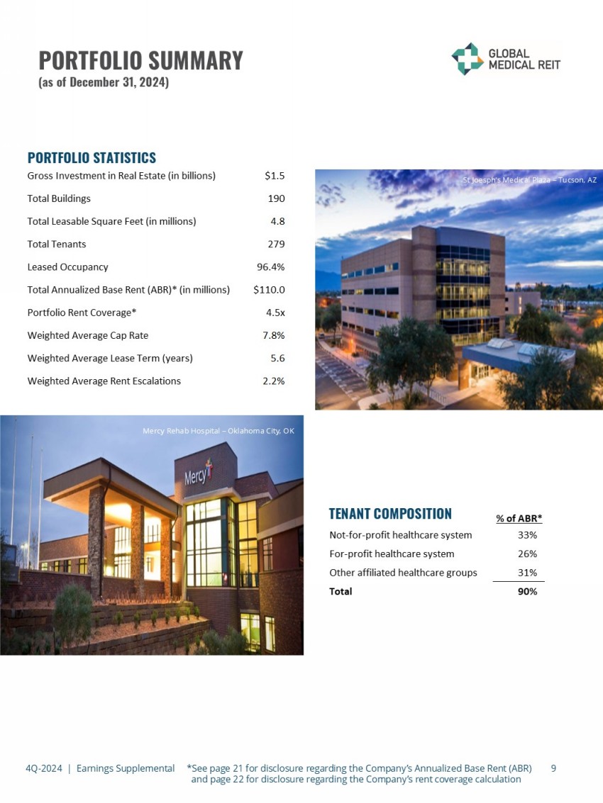 4Q - 2024 | Earnings Supplemental *See page 21 for disclosures regarding the Company’s Annualized Base Rent (ABR) and Capitalization Rate (Cap Rate) 8 ACQUISITIONS / DISPOSITIONS (as of February 26, 2025) Acquisitions Under Contract As previously announced, the Company entered into a purchase agreement to acquire a five - property portfolio for an aggregate purchase price of $69.6 million at a cap rate of 9.0%. As of February 26, 2025, the Company completed the acquisition of thre e o f the five properties for an aggregate purchase price of $31.5 million (see the table above). The Company expects to complete the acquisition of the remaining two properties during the second quarter of 2025. The Company’s obligation to close the remainde r o f this acquisition is subject to certain customary terms and conditions. Accordingly, there is no assurance that the Company wi ll close the remainder of this acquisition on a timely basis or at all. Pediatrics Plus – Russellville, AR Dispositions During the fourth quarter of 2024, the Company entered into the Joint Venture with Heitman and sold two properties to the Joi nt Venture, generating $35.2 million of gross proceeds, and completed the disposition of two additional properties generating gr oss proceeds of $5.3 million, resulting in an aggregate gain from the four dispositions of $5.8 million. For the full year 2024, the Company completed seven dispositions, including the two properties sold to the Joint Venture, gen era ting aggregate gross proceeds of $60.7 million, resulting in an aggregate gain on sale of $4.2 million. The weighted average cap r ate of the Company’s 2024 dispositions was 9.0%. Acquisition Date Property City, State Leasable Square Feet Contractual Purchase Price (in thousands) Annualized Base Rent* (in thousands) Capitalization Rate* 7/11/2024 Trinity Health Clinic and ASC Minot, ND 24,795 $9,060 $717 7.9% 7/11/2024 Henry Ford OptimEyes Vision Center Clinton Township, MI 20,548 6,773 554 8.2% 7/11/2024 Henry Ford OptimEyes Vision Center Westland, MI 20,000 5,271 468 8.9% 7/11/2024 Family Medicine Cerritos Cerritos, CA 11,551 5,200 379 7.3% 7/11/2024 Spartanburg County Clinic Spartanburg, SC 17,600 4,508 364 8.1% Third Quarter Total/Weighted Average: 94,494 $30,812 $2,482 8.1% 10/2/2024 Pediatrics Plus Conway, AR 40,108 $11,150 $891 8.0% 10/2/2024 Pediatrics Plus Little Rock, AR 31,700 8,700 705 8.1% 10/2/2024 Pediatrics Plus Russellville, AR 22,000 5,800 477 8.2% 10/2/2024 EHA Surgery Center Sarasota, FL 17,770 5,950 444 7.5% 10/2/2024 The Eye Associates Venice, FL 10,563 4,600 334 7.3% 10/2/2024 The Eye Associates Ruskin, FL 5,620 1,820 144 7.9% 10/2/2024 The Eye Associates Bradenton, FL 6,048 2,000 155 7.8% 10/2/2024 The Eye Associates Bradenton, FL 7,497 2,650 224 8.5% 10/2/2024 The Eye Associates Bradenton, FL 4,317 1,500 129 8.6% 10/2/2024 The Eye Associates ASC Bradenton, FL 14,103 5,350 421 7.9% Fourth Quarter Total/Weighted Average: 159,726 $49,520 $3,924 7.9% 2024 Total/Weighted Average: 254,220 $80,332 $6,407 8.0% 2/7/2025 St. Joseph's Medical Plaza Tucson, AZ 95,598 $16,000 $1,223 7.6% 2/7/2025 St. Mary's Medical Plaza Tucson, AZ 66,590 10,500 976 9.3% 2/7/2025 Slippery Rock MOB Slippery Rock, PA 26,686 5,000 574 11.5% 2025 Total/Weighted Average To-Date: 188,874 $31,500 $2,773 8.8% 2024 Acquisitions 2025 Acquisitions Completed To-Date