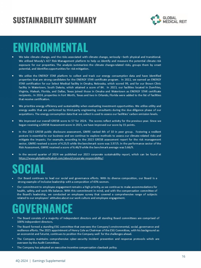 4Q - 2024 | Earnings Supplemental 16 SUSTAINABILITY SUMMARY We take climate change, and the risks associated with climate change, seriously — both physical and transitional . We utilized Moody’s 427 Risk Management platform to help us identify and measure the potential climate risk exposure for our properties . The analysis summarizes the climate change - related risks, groups them by onset potential, and identifies opportunities for risk mitigation . We utilize the ENERGY STAR platform to collect and track our energy consumption data and have identified properties that are strong candidates for the ENERGY STAR certificate program . In 2022 , we earned an ENERGY STAR certification for our Select Medical facility in Omaha, Nebraska, which scored 99 , and for our Brown Clinic facility in Watertown, South Dakota, which attained a score of 84 . In 2023 , our facilities located in Dumfries, Virginia, Hialeah, Florida, and Dallas, Texas joined those in Omaha and Watertown as ENERGY STAR certificate recipients .. In 2024 , properties in Fort Worth, Texas and two in Orlando, Florida were added to the list of facilities that receive certification . We prioritize energy efficiency and sustainability when evaluating investment opportunities . We utilize utility and energy audits that are performed by third - party engineering consultants during the due diligence phase of our acquisitions . The energy consumption data that we collect is used to assess our facilities’ carbon emission levels . We improved our overall GRESB score to 57 for 2024 . The scores reflect activity for the previous year . Since we began receiving a GRESB Assessment score in 2021 , we have improved our score by 15 points . In the 2023 GRESB public disclosure assessment, GMRE ranked 4 th of 10 in peer group . Fostering a resilient posture is essential to our business and we continue to explore methods to assess our climate - related risks and mitigate the impacts . For example, according to the 2023 GRESB assessment report for the risk management sector, GMRE received a score of 4 . 25 / 5 while the benchmark score was 3 . 97 / 5 . In the performance sector of the Risk Assessment, GMRE received a score of 6 . 46 / 9 while the benchmark average was 5 . 66 / 9 . In the second quarter of 2024 we published our 2023 corporate sustainability report, which can be found at https : //www . globalmedicalreit . com/about/corporate - responsibility/ . ENVIRONMENTAL SOCIAL Our Board continues to lead our social and governance efforts . With its diverse composition, our Board is a strong example of inclusive leadership with a composition of 43 % women . • Our commitment to employee engagement remains a high - priority, as we continue to make accommodations for health, safety, and work - life balance . With this commitment in mind, and with the compensation committee of the Board’s leadership, we conducted an employee survey that covered a comprehensive range of subjects related to our employees’ attitudes about our work culture and employee engagement . GOVERNANCE • The Board consists of a majority of independent directors and all standing Board committees are comprised of 100 % independent directors . • The Board formed a standing ESG committee that oversees the Company’s environmental, social, governance and resilience efforts . The 2025 appointment of Henry Cole as Chairman of the ESG Committee, with his background as an economist and futurist, continues to position the Company well for the challenges ahead . • The Company maintains comprehensive cyber - security incident prevention and response protocols which are overseen by the Audit Committee . • The Company has adopted an executive incentive compensation clawback policy . • GMRE is a member of the National Association of Corporate Directors .