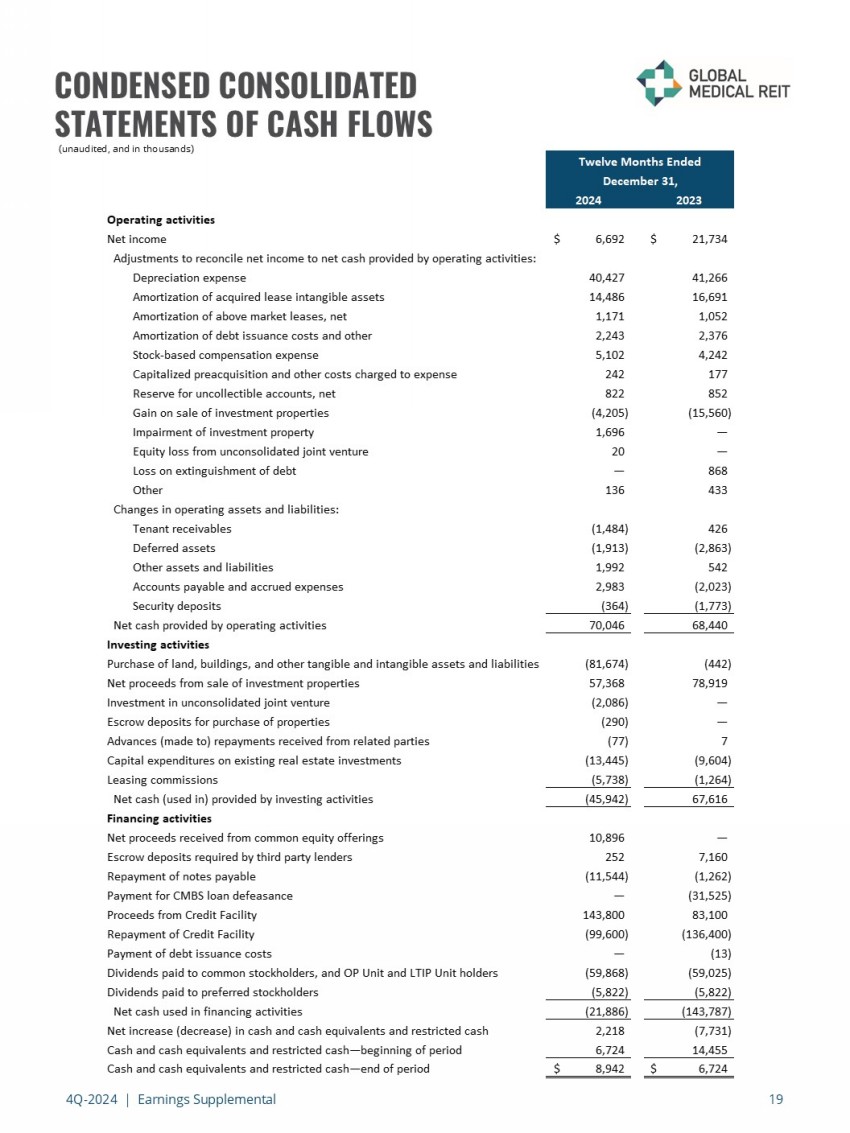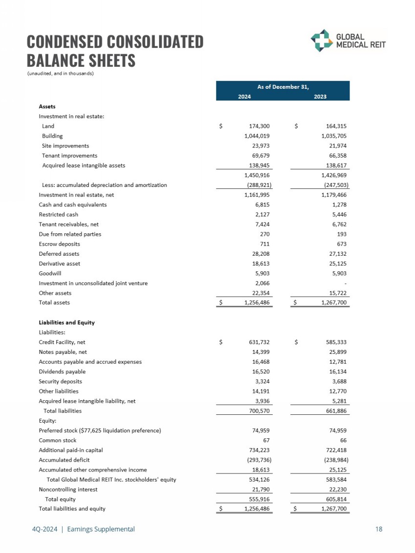 4Q - 2024 | Earnings Supplemental 18 CONDENSED CONSOLIDATED BALANCE SHEETS (unaudited, and in thousands) 2024 2023 Assets Investment in real estate: Land 174,300$ 164,315$ Building 1,044,019 1,035,705 Site improvements 23,973 21,974 Tenant improvements 69,679 66,358 Acquired lease intangible assets 138,945 138,617 1,450,916 1,426,969 Less: accumulated depreciation and amortization (288,921) (247,503) Investment in real estate, net 1,161,995 1,179,466 Cash and cash equivalents 6,815 1,278 Restricted cash 2,127 5,446 Tenant receivables, net 7,424 6,762 Due from related parties 270 193 Escrow deposits 711 673 Deferred assets 28,208 27,132 Derivative asset 18,613 25,125 Goodwill 5,903 5,903 Investment in unconsolidated joint venture 2,066 - Other assets 22,354 15,722 Total assets 1,256,486$ 1,267,700$ Liabilities and Equity Liabilities: Credit Facility, net 631,732$ 585,333$ Notes payable, net 14,399 25,899 Accounts payable and accrued expenses 16,468 12,781 Dividends payable 16,520 16,134 Security deposits 3,324 3,688 Other liabilities 14,191 12,770 Acquired lease intangible liability, net 3,936 5,281 Total liabilities 700,570 661,886 Equity: Preferred stock ($77,625 liquidation preference) 74,959 74,959 Common stock 67 66 Additional paid-in capital 734,223 722,418 Accumulated deficit (293,736) (238,984) Accumulated other comprehensive income 18,613 25,125 Total Global Medical REIT Inc. stockholders' equity 534,126 583,584 Noncontrolling interest 21,790 22,230 Total equity 555,916 605,814 Total liabilities and equity 1,256,486$ 1,267,700$ As of December 31,