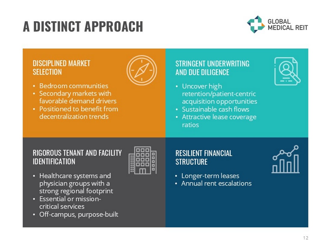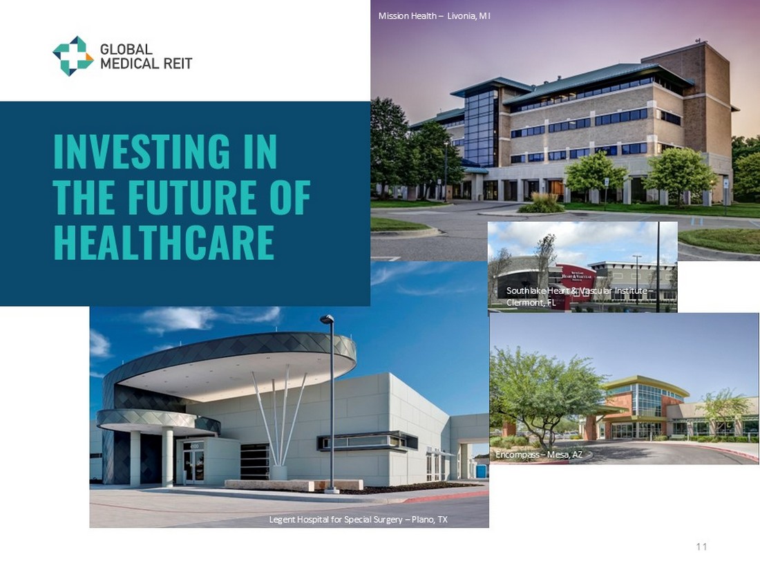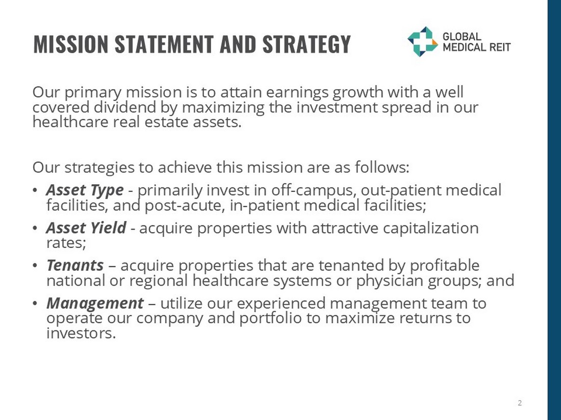 Our primary mission is to attain earnings growth with a well covered dividend by maximizing the investment spread in our healthcare real estate assets. Our strategies to achieve this mission are as follows: • Asset Type - primarily invest in off - campus, out - patient medical facilities, and post - acute, in - patient medical facilities; • Asset Yield - acquire properties with attractive capitalization rates; • Tenants – acquire properties that are tenanted by profitable national or regional healthcare systems or physician groups; and • Management – utilize our experienced management team to operate our company and portfolio to maximize returns to investors. 2 MISSION STATEMENT AND STRATEGY