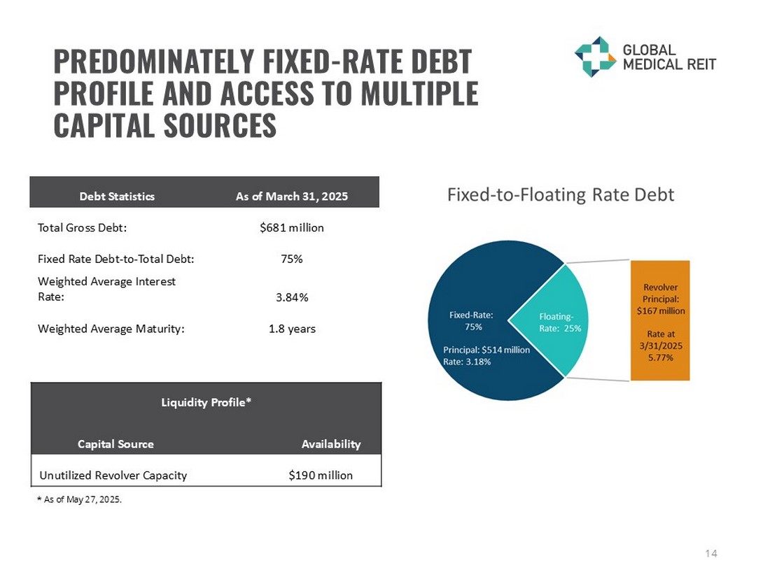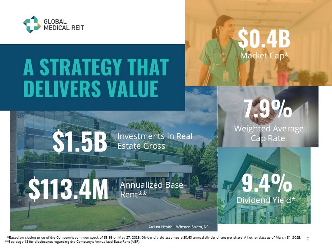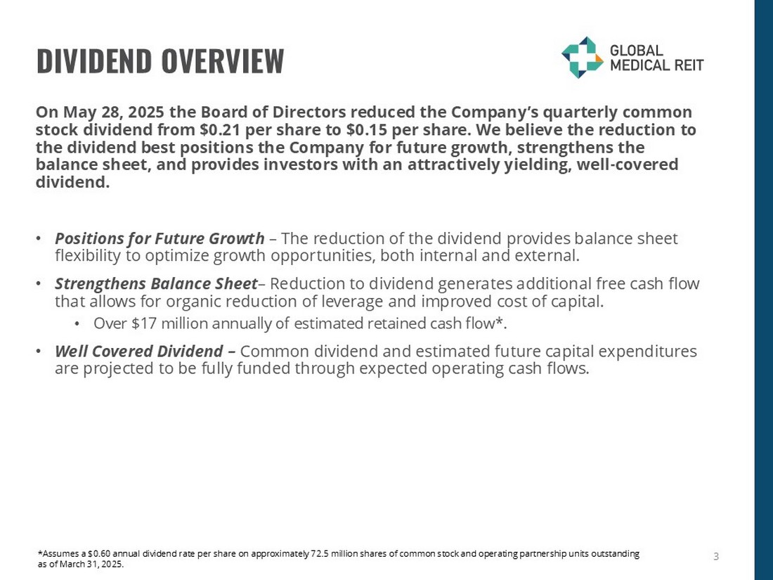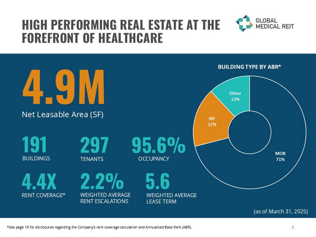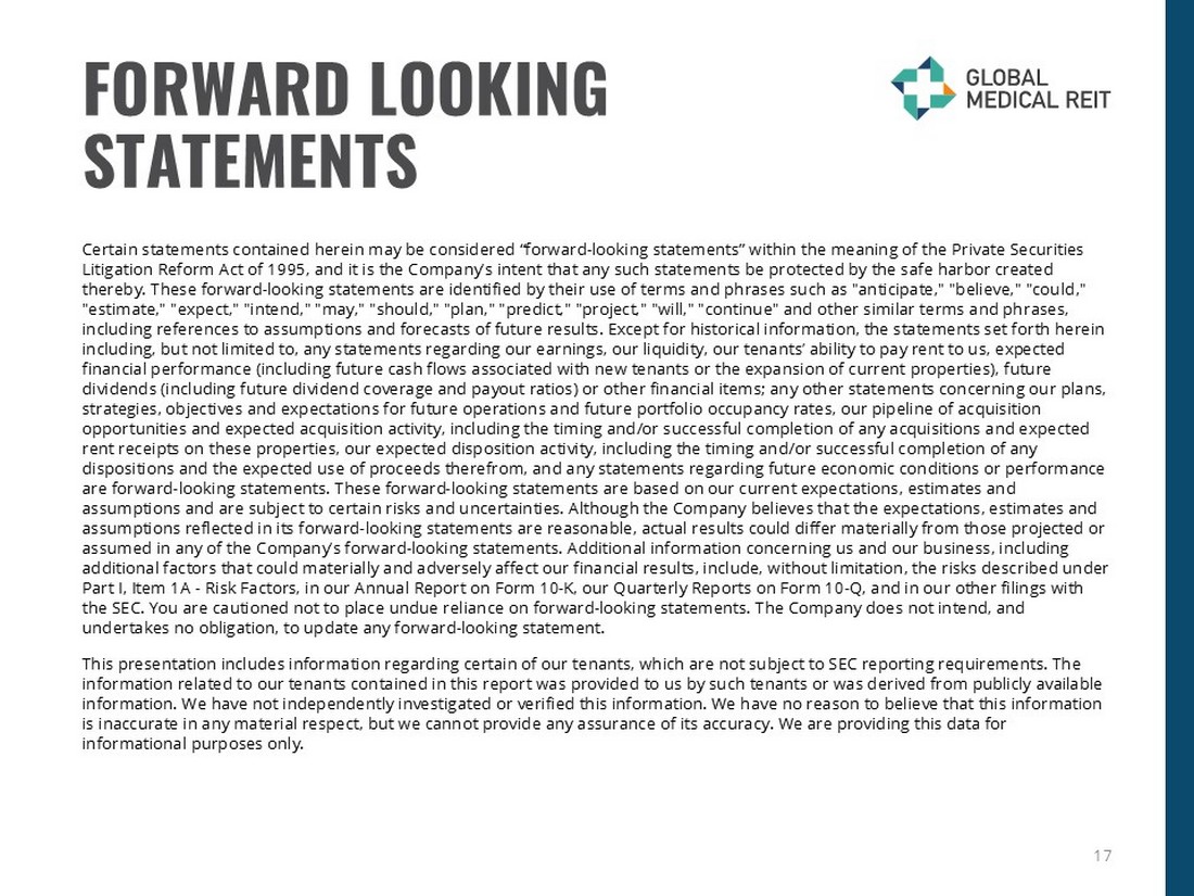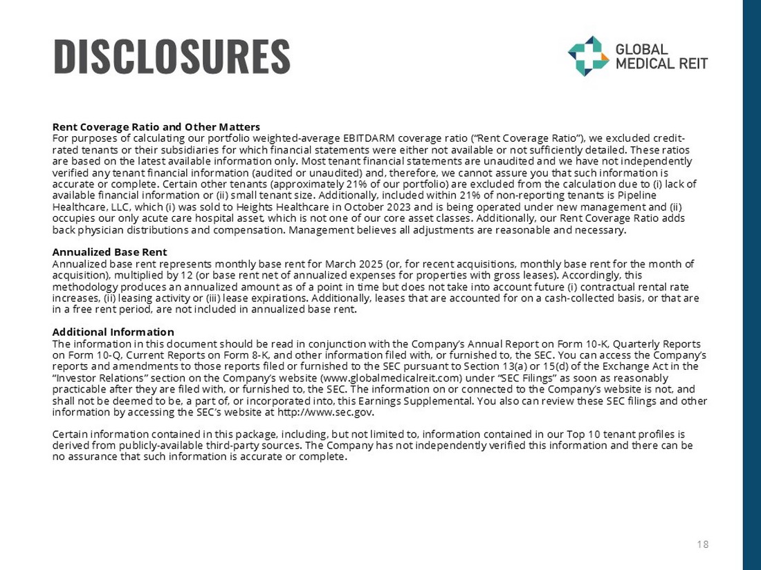 DISCLOSURES Rent Coverage Ratio and Other Matters For purposes of calculating our portfolio weighted - average EBITDARM coverage ratio (“Rent Coverage Ratio”), we excluded credit - rated tenants or their subsidiaries for which financial statements were either not available or not sufficiently detailed. Th ese ratios are based on the latest available information only. Most tenant financial statements are unaudited and we have not independen tly verified any tenant financial information (audited or unaudited) and, therefore, we cannot assure you that such information i s accurate or complete. Certain other tenants (approximately 21% of our portfolio) are excluded from the calculation due to ( i ) lack of available financial information or (ii) small tenant size. Additionally, included within 21 % of non - reporting tenants is Pipeline Healthcare, LLC, which ( i ) was sold to Heights Healthcare in October 2023 and is being operated under new management and (ii) occupies our only acute care hospital asset, which is not one of our core asset classes. Additionally, our Rent Coverage Rati o a dds back physician distributions and compensation. Management believes all adjustments are reasonable and necessary. Annualized Base Rent Annualized base rent represents monthly base rent for March 2025 (or, for recent acquisitions, monthly base rent for the mont h o f acquisition), multiplied by 12 (or base rent net of annualized expenses for properties with gross leases). Accordingly, this methodology produces an annualized amount as of a point in time but does not take into account future ( i ) contractual rental rate increases, (ii) leasing activity or (iii) lease expirations. Additionally, leases that are accounted for on a cash - collected bas is, or that are in a free rent period, are not included in annualized base rent. Additional Information The information in this document should be read in conjunction with the Company’s Annual Report on Form 10 - K, Quarterly Reports on Form 10 - Q, Current Reports on Form 8 - K, and other information filed with, or furnished to, the SEC. You can access the Compan y’s reports and amendments to those reports filed or furnished to the SEC pursuant to Section 13(a) or 15(d) of the Exchange Act in the “Investor Relations” section on the Company’s website (www.globalmedicalreit.com) under “SEC Filings” as soon as reasonably practicable after they are filed with, or furnished to, the SEC. The information on or connected to the Company’s website is not , and shall not be deemed to be, a part of, or incorporated into, this Earnings Supplemental. You also can review these SEC filings an d other information by accessing the SEC’s website at http://www.sec.gov. Certain information contained in this package, including, but not limited to, information contained in our Top 10 tenant prof ile s is derived from publicly - available third - party sources. The Company has not independently verified this information and there can b e no assurance that such information is accurate or complete. 18