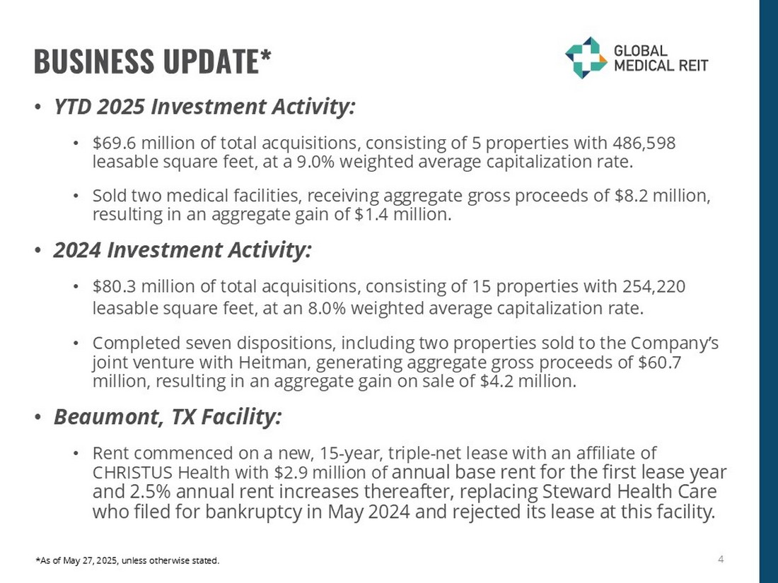 • YTD 2025 Investment Activity: • $69.6 million of total acquisitions, consisting of 5 properties with 486,598 leasable square feet, at a 9.0% weighted average capitalization rate. • Sold two medical facilities, receiving aggregate gross proceeds of $8.2 million, resulting in an aggregate gain of $1.4 million. • 2024 Investment Activity: • $80.3 million of total acquisitions, consisting of 15 properties with 254,220 leasable square feet, at an 8.0% weighted average capitalization rate. • Completed seven dispositions, including two properties sold to the Company’s joint venture with Heitman, generating aggregate gross proceeds of $60.7 million, resulting in an aggregate gain on sale of $4.2 million. • Beaumont, TX Facility: • Rent commenced on a new, 15 - year, triple - net lease with an affiliate of CHRISTUS Health with $2.9 million of annual base rent for the first lease year and 2.5% annual rent increases thereafter, replacing Steward Health Care who filed for bankruptcy in May 2024 and rejected its lease at this facility. 4 BUSINESS UPDATE* *As of May 27, 2025, unless otherwise stated.