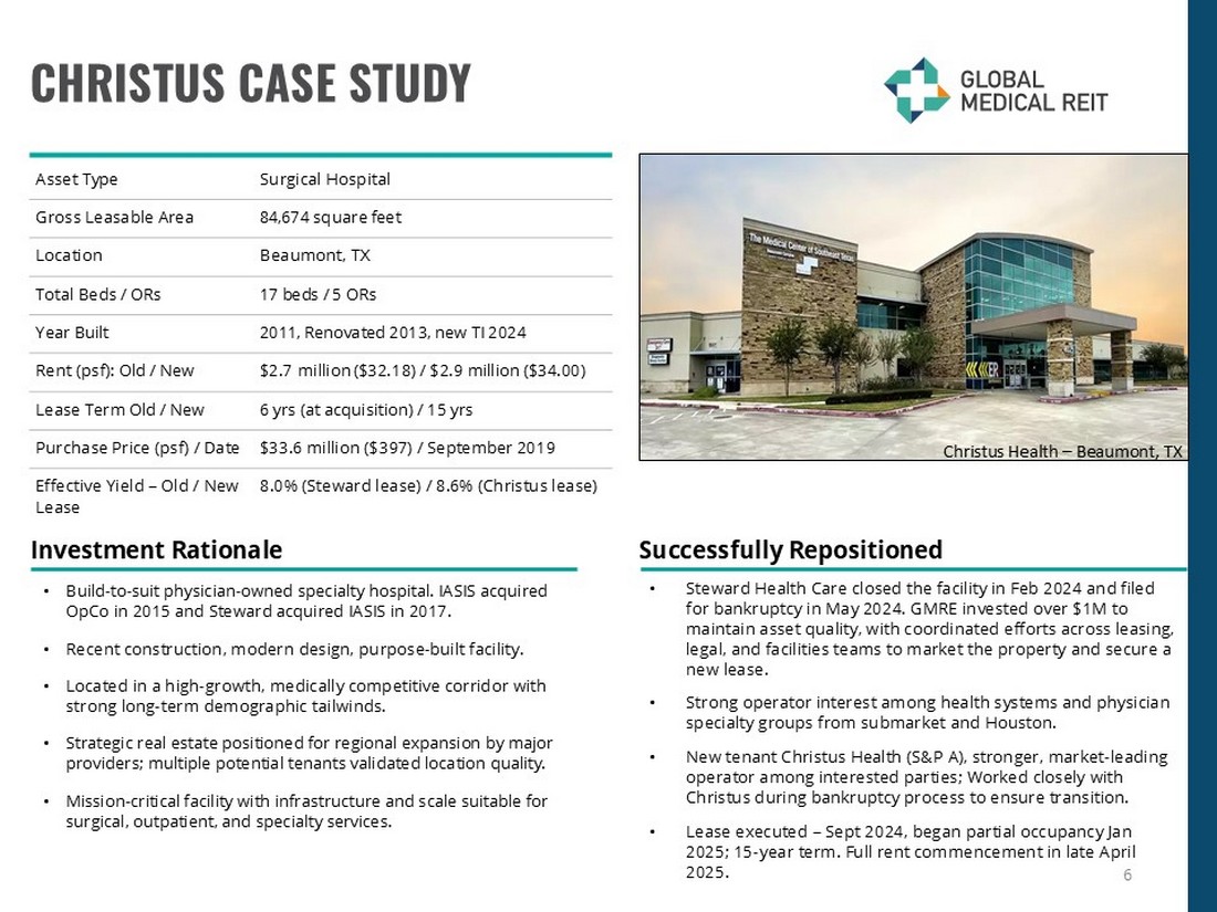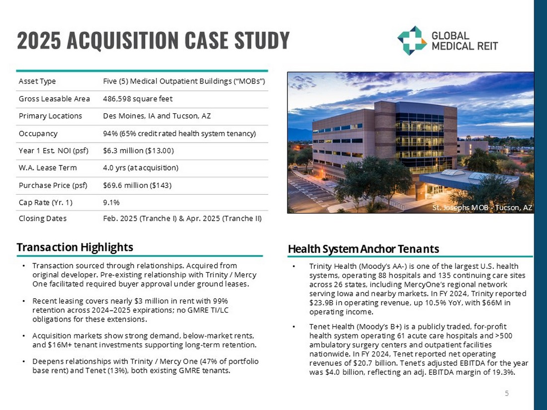 5 2025 ACQUISITION CASE STUDY Five (5) Medical Outpatient Buildings (“MOBs”) Asset Type 486,598 square feet Gross Leasable Area Des Moines, IA and Tucson, AZ Primary Locations 94% (65% credit rated health system tenancy) Occupancy $ 6.3 million ($ 13.00) Year 1 Est. NOI ( psf) 4.0 yrs (at acquisition) W.A. Lease Term $ 69.6 million ($ 143 ) Purchase Price (psf) 9.1 % Cap Rate (Yr. 1 ) Feb. 2025 (Tranche I) & Apr. 2025 (Tranche II) Closing Dates Transaction Highlights • Transaction sourced through relationships. Acquired from original developer. Pre - existing relationship with Trinity / Mercy One facilitated required buyer approval under ground leases. • Recent leasing covers nearly $3 million in rent with 99% retention across 2024 – 2025 expirations; no GMRE TI/LC obligations for these extensions. • Acquisition markets show strong demand, below - market rents, and $16M+ tenant investments supporting long - term retention. • Deepens relationships with Trinity / Mercy One (47% of portfolio base rent) and Tenet (13%), both existing GMRE tenants. Health System Anchor Tenants • Trinity Health (Moody’s AA - ) is one of the largest U.S. health systems, operating 88 hospitals and 135 continuing care sites across 26 states, including MercyOne’s regional network serving Iowa and nearby markets. In FY 2024, Trinity reported $23.9B in operating revenue, up 10.5% YoY, with $66M in operating income. • Tenet Health (Moody’s B+) is a publicly traded, for - profit health system operating 61 acute care hospitals and >500 ambulatory surgery centers and outpatient facilities nationwide. In FY 2024, Tenet reported net operating revenues of $20.7 billion. Tenet’s adjusted EBITDA for the year was $4.0 billion, reflecting an adj. EBITDA margin of 19.3%. St. Josephs MOB - Tucson, AZ