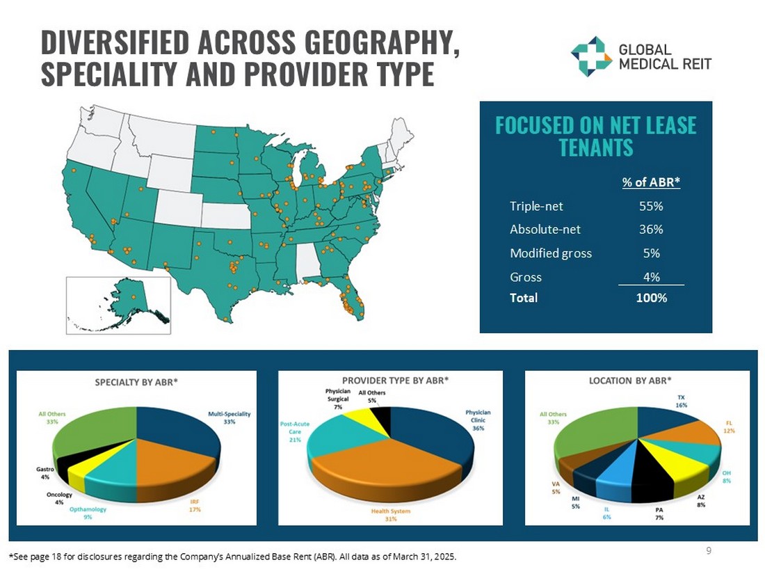 HIGH PERFORMING REAL ESTATE AT THE FOREFRONT OF HEALTHCARE 8 4.4X RENT COVERAGE* 2.2% WEIGHTED AVERAGE RENT ESCALATIONS 5.6 WEIGHTED AVERAGE LEASE TERM 191 BUILDINGS 297 TENANTS 95.6% OCCUPANCY 4.9M Net Leasable Area (SF) *See page 18 for disclosures regarding the Company’s rent coverage calculation and Annualized Base Rent (ABR). BUILDING TYPE BY ABR* (as of March 31, 2025)