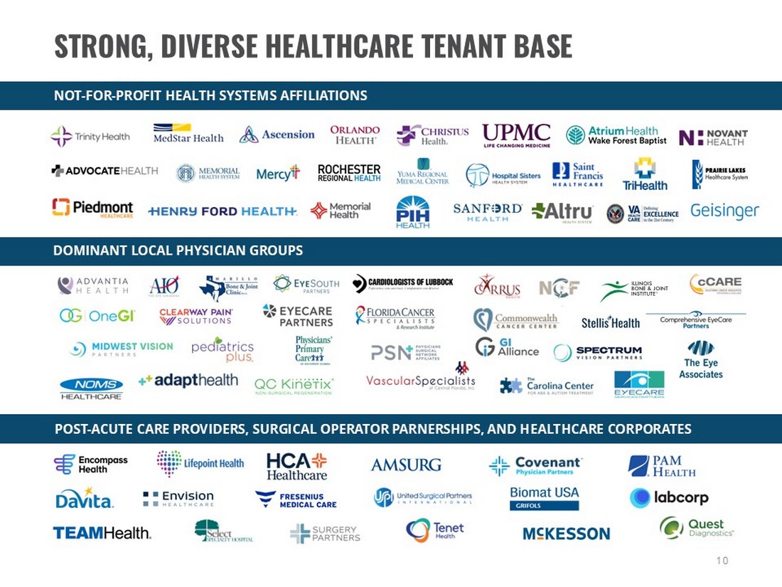 10 DOMINANT LOCAL PHYSICIAN GROUPS POST - ACUTE CARE PROVIDERS, SURGICAL OPERATOR PARNERSHIPS, AND HEALTHCARE CORPORATES STRONG, DIVERSE HEALTHCARE TENANT BASE NOT - FOR - PROFIT HEALTH SYSTEMS AFFILIATIONS DOMINANT LOCAL PHYSICIAN GROUPS