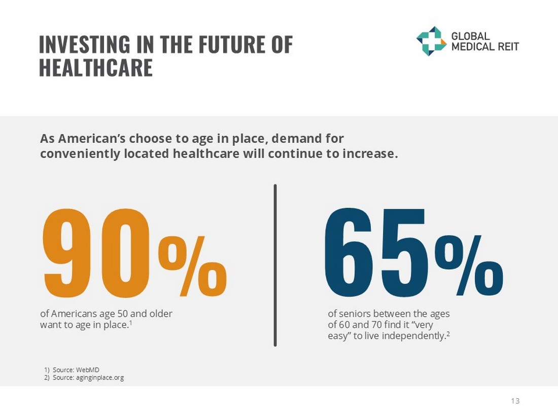 INVESTING IN THE FUTURE OF HEALTHCARE 13 90 % of Americans age 50 and older want to age in place. 1 65 % of seniors between the ages of 60 and 70 find it “very easy” to live independently. 2 As American’s choose to age in place, demand for conveniently located healthcare will continue to increase. 1) Source: WebMD 2) Source: aginginplace.org