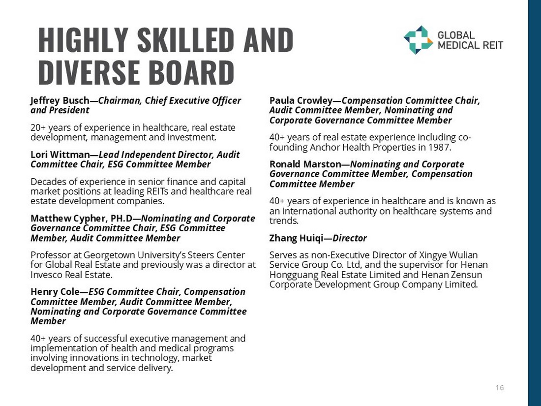 INSTITUTIONAL KNOWLEDGE, HANDS - ON APPROACH Jeffrey Busch — Chairman, Chief Executive Officer and President 20+ years of experience in healthcare, real estate development, management and investment Robert Kiernan — Chief Financial Officer and Treasurer 30+ years of experience in financial accounting, reporting and management, with extensive experience in SEC reporting and SOX compliance Alfonzo Leon — Chief Investment Officer 20+ years of experience in real estate finance and has completed $3 billion of transactions Danica Holley — Chief Operating Officer 20+ years of management and business development experience Jamie Barber — General Counsel and Corporate Secretary 20+ years of experience with SEC compliance and reporting matters, corporate governance, investment banking and REIT - related capital markets 15