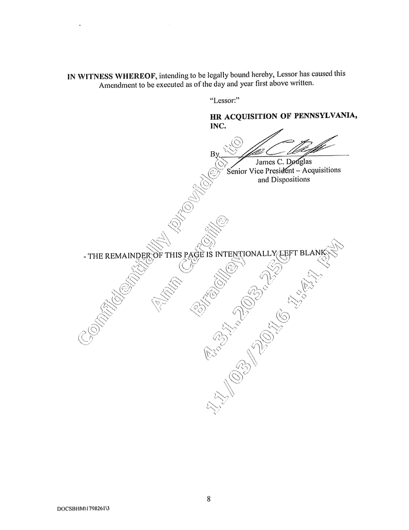 The Parties to this Assignment are HR ACQUISITION OF PENNSYLVANIA, INC., a Pennsylvania corporation (“Assignor”), whose mailing address is 3310 West End Avenue, Suite 700, Nashville, Tennessee 37203, and GMR MECHANICSBURG, LLC, a Delaware limited liability company (“Assignee”), whose mailing address is 4800 Montgomery Lane, Suite 450, Bethesda, Maryland 20814. This Assignment shall be effective as of December 20, 2016 (the “Effective Date”). Assignor and Assignee are sometimes referred to herein as the “Parties.”