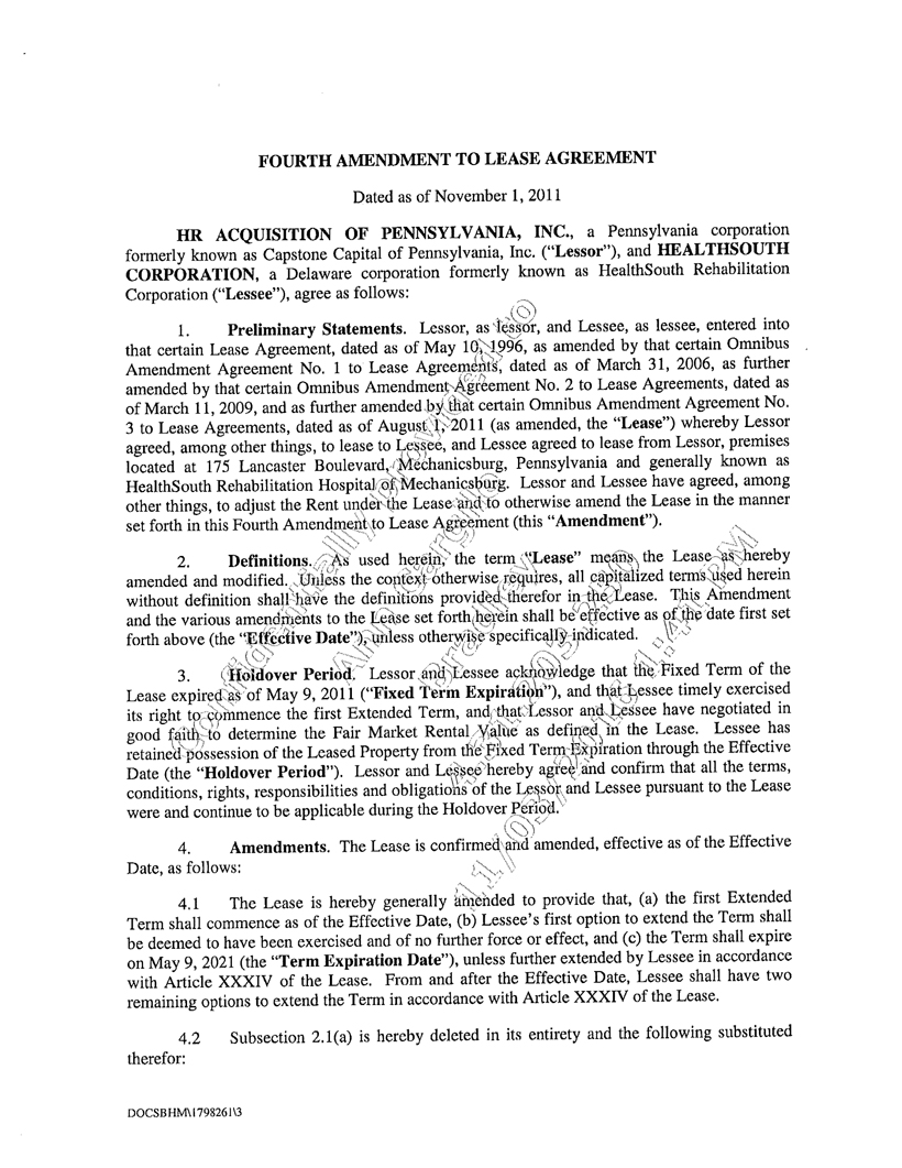 1. Preliminary Statements. The parties hereto entered into that certain Omnibus Amendment Agreement No. 1 to Lease Agreements, dated as of March 31, 2006 (the “First Omnibus Amendment”) and that certain Omnibus Amendment Agreement No. 2 to Lease Agreements, dated as of March 11, 2009 (the “Second Omnibus Amendment” and, together with the First Omnibus Amendment, the “Omnibus Amendments”). HR Pennsylvania, as lessor, and HS Parent, as lessee, are parties to that certain Lease Agreement dated as of March 24, 1995, as amended by the Omnibus Amendments (as amended, the “Great Lakes Lease”), for the lease of the inpatient rehabilitation hospital and related real property and improvements located at 143 East Second Street situated in Erie County, Pennsylvania. HR Pennsylvania, as lessor, and HS Parent, as lessee, are parties to that certain Lease Agreement dated as of May 10, 1996, as amended by the Omnibus Amendments (as amended, the “Mechanicsburg Lease”), for the lease of the inpatient rehabilitation hospital and related real property and improvements located at 175 Lancaster Boulevard, Mechanicsburg, Pennsylvania. HR Pennsylvania, as lessor, and HS Parent, as lessee, are parties to that certain Lease Agreement dated as of May 10, 1996, as amended by the Omnibus Amendments (as amended, the “Altoona Lease”), for the lease of the inpatient rehabilitation hospital and related real property and improvements located at 2005 Valley View Boulevard, Altoona, Pennsylvania 16602. HR Alabama, as lessor, and HS Montgomery, as lessee, are parties to that certain Lease Agreement dated as of September 30, 1998, as amended by the Omnibus Amendments (as amended, the “Montgomery Lease”), for the lease of the inpatient rehabilitation hospital and related real property and improvements located at 4465 Narrow Lane Road, Montgomery, Alabama 36116. Pennsylvania HRT (originally styled as “HRT of Pennsylvania, Inc.”), as lessor, and HS Nittany Valley, as lessee, are parties to that certain Lease Agreement dated as of September 30, 1998, as amended by the Omnibus Amendments (as amended, the “Nittany Valley Lease”), for the lease of the inpatient rehabilitation hospital and related real property and improvements located at 550 W. College Avenue, Pleasant Gap, Pennsylvania 16823. HR San Antonio, as lessor, and HS Beaumont, as lessee, are parties to that certain Lease Agreement dated as of April 1, 1996, as amended by that First Amendment to Facility Lease dated as of February 7, 2006, as amended further by the Omnibus Amendments (as amended, the “Beaumont Lease”), for the lease of the inpatient rehabilitation hospital and related real property and improvements located at 3340 Plaza 10 Boulevard, Beaumont, Texas 77707. HR Parent, as lessor, and HS Tallahassee, as lessee, are parties to that certain Lease Agreement having a commencement date of October 1, 1998, as amended by the Omnibus Amendments (as amended, the “Tallahassee Lease”), for the lease of the inpatient rehabilitation hospital and related real property and improvements located at 1675 Riggins Road, Tallahassee, Florida 32308. Pennsylvania HRT, as lessor, and HS York, as lessee, are parties to that certain Lease Agreement dated as of September 30, 1998, as amended by the Omnibus Amendments (as amended, the “York Lease”), for the lease of the inpatient rehabilitation hospital and related real property and improvements located at 1850 Normandie Drive, York, Pennsylvania 17404. The Great Lakes Lease, the Mechanicsburg Lease, the Altoona Lease, the Montgomery Lease, the Nittany Valley Lease, the Beaumont Lease, the Tallahassee Lease and the York Lease are referred to herein, individually as a “Lease” and, collectively, as the “Leases”. HS Parent has executed (i) the Guaranty of Obligations Under Lease Agreement, dated as of September 30, 1998, with respect to the Montgomery Lease (the “Montgomery Guaranty”), (ii) the Guaranty of Obligations Under Lease Agreement, dated as of September 30, 1998, with respect to the Nittany Valley Lease (the “Nittany Valley Guaranty”), (iii) the Guaranty of Obligations Under Lease Agreement, dated as of March 11, 2009, with respect to the Beaumont Lease (the “Beaumont Guaranty”), (iv) the Guaranty of Obligations Under Lease Agreement, dated as of September 30, 1998, with respect to the Tallahassee Lease (the “Tallahassee Guaranty”), and (v) the Guaranty of Obligations Under Lease Agreement, dated as of September 30, 1998, with respect to the York Lease (the “York Guaranty” and, together with the Montgomery Guaranty, the Nittany Valley Guaranty, the Beaumont Guaranty and the Tallahassee Guaranty, the “Lease Guaranties”). Pursuant to the Lease Guaranties, certain of the applicable Lessee’s obligations have been guaranteed, and the Lease Guaranties are an integral part of the transactions contemplated by the parties hereto. HR Pennsylvania, as lessor, and HS Parent, as lessee, are parties to that certain Lease Agreement, dated as of June 30, 1997, as amended and assigned pursuant to that certain Amendment to Building Lease and Assignment and Assumption of Building Lease, dated as of even date herewith (the “Pittsburgh Amendment and Assignment”), among HR Pennsylvania, as lessor, HS Parent, as assignor, and Pittsburgh Specialty Hospital, LLC, a Delaware limited liability company, as assignee (as amended and assigned, the “Pittsburgh Lease”), for the lease of the premises located at 2380 McGinley Road, Monroeville, Pennsylvania, commonly known as the Greater Pittsburgh Rehabilitation Hospital. The parties wish to clarify certain matters with respect to the Omnibus Amendments and the Pittsburgh Lease and to make certain amendments to the Leases in the manner set forth in this Omnibus Amendment Agreement No. 3 to Lease Agreements (this “Agreement”).