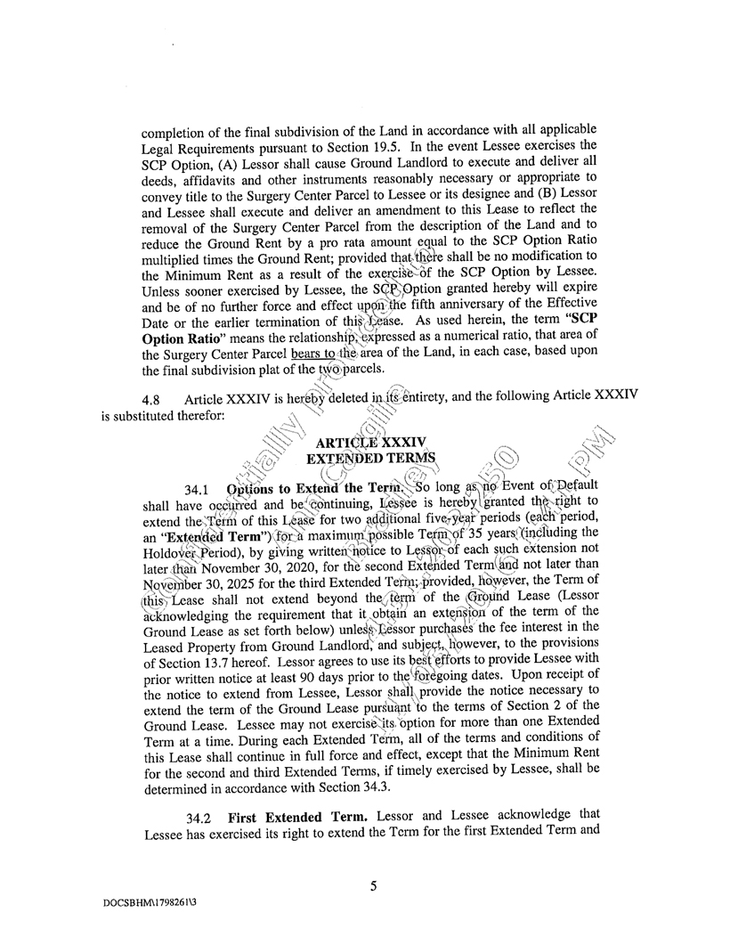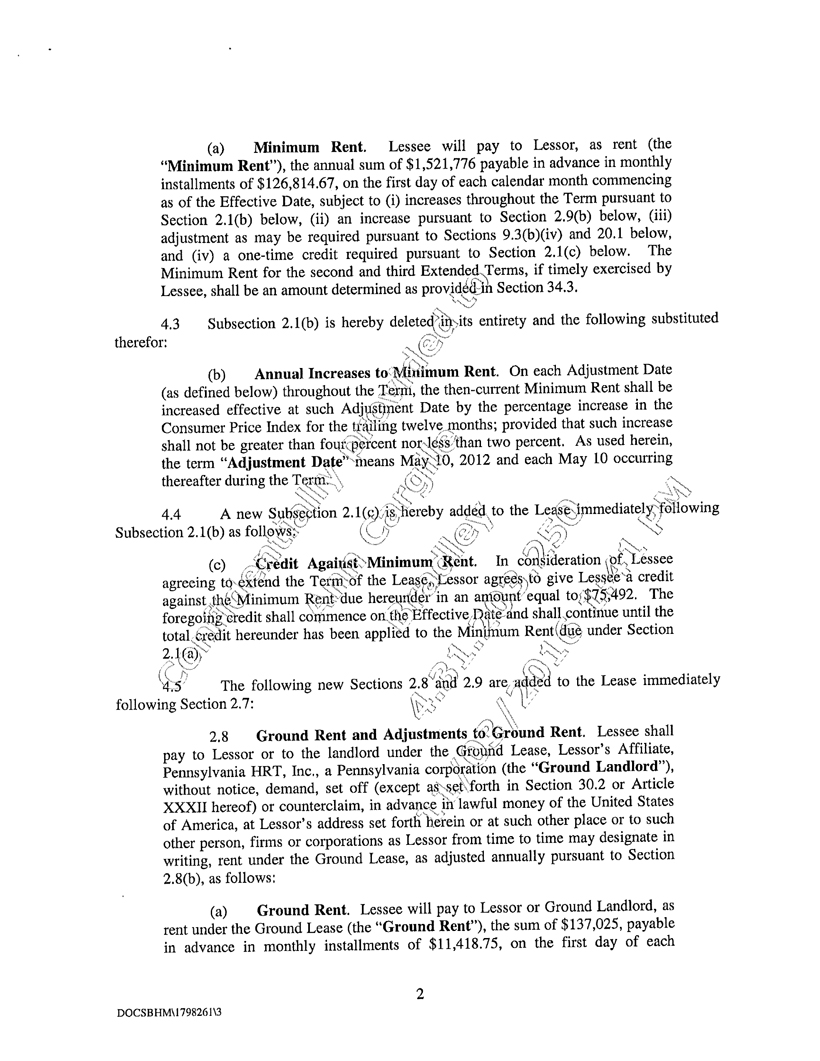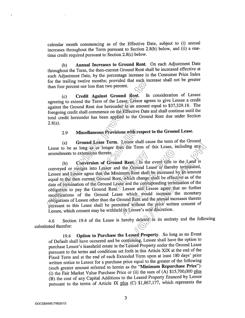 “Ground Lease” means that certain Second Amended and Restated Land Lease Agreement dated as of December 18, 1987, between Healthland, Incorporated, a Pennsylvania corporation (“Healthland”) and Seller, a memorandum of which is recorded in Miscellaneous Book 344, Page 620, as conveyed from Healthland to Ronald L. Felty and Walter W. Wilt by deed dated , 19 , and recorded in Deed Book , Page , of the Public Records of Cumberland County, Pennsylvania, and as amended in that certain Amendment to Second Amended and Restated Land Lease Agreement dated as of May 10, 1996, among Walter W. Wilt and Ronald L. Felty, as landlord, and Lessor, as tenant in order to, among other things, (i) extend the term through April 30, 2011, (ii) increase the rent due thereunder initially to $150,000.00 per year, and (iii) increase the rent at the rate of increase of the CPI (not to exceed 5% per year) beginning on May 10, 1997.
