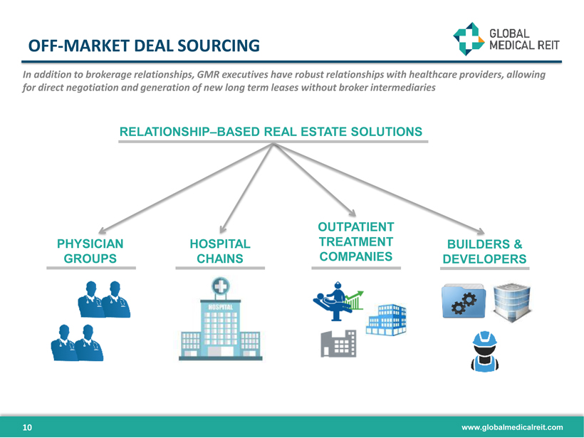 GMR INVESTMENT CRITERIA FOCUS ON TENANT OPERATIONS Excellent medical practice groups with sustainable practices Single, long-term tenants = no vacancy rate Existing, long-standing provider Strong and diversified payor mix STRATEGIC LOCATIONS Position to take advantage of decentralization trends Identifiable, predictable, historical market demand Proximity to related resources for reliable patient flow Barriers to entry/competition HIGH-QUALITY FACILITIES State-of-the-art technology and design Facilities recently built or renovated Facilities core to provider business model Functionality, reusability, conversion value PROVIDERS CRITICAL TO LOCAL POPULATIONS Dominant specialty group practices; regional sole providers Regional specialty hospitals Critical access hospitals Long-term practice success / expert hospital management history 9 www.globalmedicalreit.com