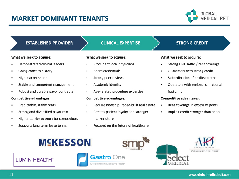 OFF-MARKET DEAL SOURCING In addition to brokerage relationships, GMR executives have robust relationships with healthcare providers, allowing for direct negotiation and generation of new long term leases without broker intermediaries RELATIONSHIP–BASED REAL ESTATE SOLUTIONS OUTPATIENT PHYSICIAN HOSPITAL TREATMENT BUILDERS & GROUPS CHAINS COMPANIES DEVELOPERS 10 www.globalmedicalreit.com