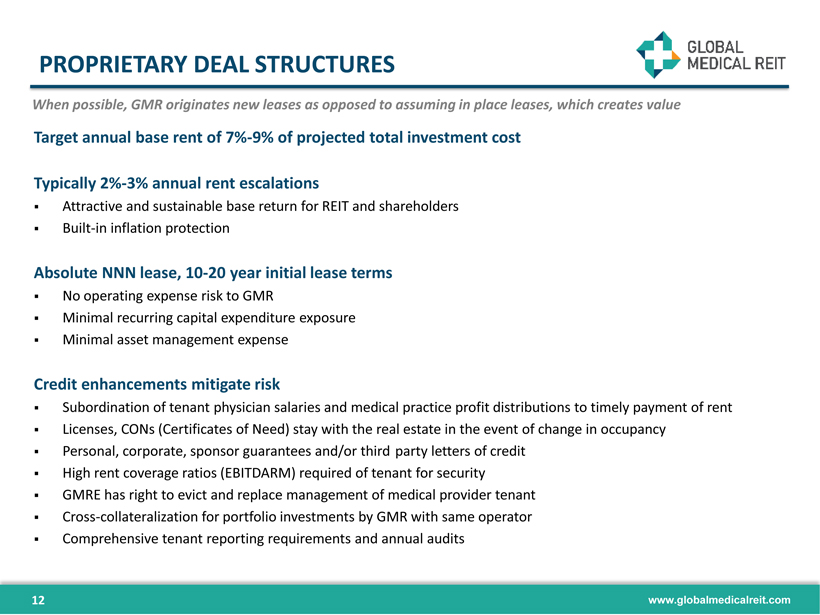 MARKET DOMINANT TENANTS ESTABLISHED PROVIDER CLINICAL EXPERTISE STRONG CREDIT What we seek to acquire: What we seek to acquire: What we seek to acquire: ▪ Demonstrated clinical leaders ▪ Prominent local physicians ▪ Strong EBITDARM / rent coverage ▪ Going concern history ▪ Board credentials ▪ Guarantors with strong credit ▪ High market share ▪ Strong peer reviews ▪ Subordination of profits to rent ▪ Stable and competent management ▪ Academic identity ▪ Operators with regional or national ▪ Robust and durable payor contracts ▪ Age-related procedure expertise footprint Competitive advantages: Competitive advantages: Competitive advantages: Predictable, stable rents Strong and diversified payor mix Higher barrier to entry for competitors Supports long term lease terms Require newer, purpose-built real estate Creates patient loyalty and stronger market share Focused on the future of healthcare ▪ ▪ Rent coverage in excess of peers Implicit credit stronger than peers 11 www.globalmedicalreit.com