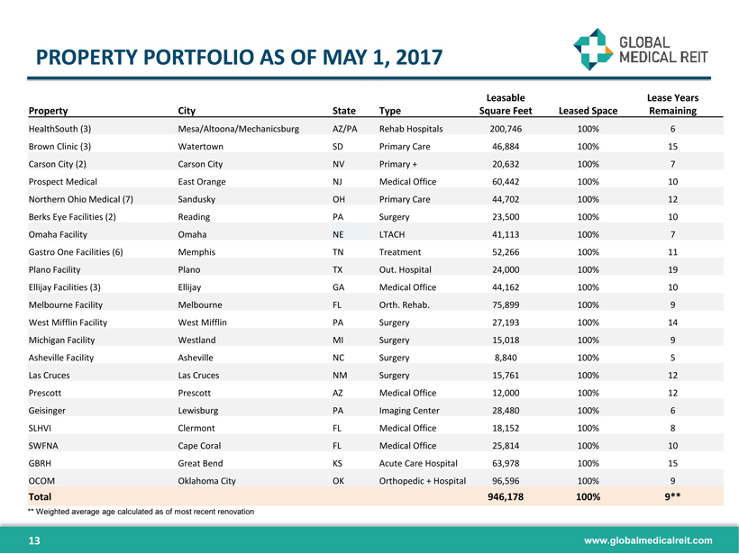 PROPRIETARY DEAL STRUCTURES When possible, GMR originates new leases as opposed to assuming in place leases, which creates value Target annual base rent of 7%-9% of projected total investment cost Typically 2%-3% annual rent escalations Attractive and sustainable base return for REIT and shareholders Built-in inflation protection Absolute NNN lease, 10-20 year initial lease terms No operating expense risk to GMR Minimal recurring capital expenditure exposure Minimal asset management expense Credit enhancements mitigate risk Subordination of tenant physician salaries and medical practice profit distributions to timely payment of rent Licenses, CONs (Certificates of Need) stay with the real estate in the event of change in occupancy Personal, corporate, sponsor guarantees and/or third party letters of credit High rent coverage ratios (EBITDARM) required of tenant for security GMRE has right to evict and replace management of medical provider tenant Cross-collateralization for portfolio investments by GMR with same operator Comprehensive tenant reporting requirements and annual audits 12 www.globalmedicalreit.com