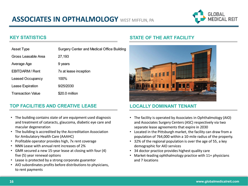 ASSOCIATES IN OPTHALMOLOGY WEST MIFFLIN, PA KEY STATISTICS STATE OF THE ART FACILITY Asset Type Surgery Center and Medical Office Building Gross Leasable Area 27,193 Average Age 9 years EBITDARM / Rent 7x at lease inception Leased Occupancy 100% Lease Expiration 9/25/2030 Transaction Value $20.0 million TOP FACILITIES AND CREATIVE LEASE The building contains state of are equipment used diagnosis and treatment of cataracts, glaucoma, diabetic eye care and macular degeneration The building is accredited by the Accreditation Association for Ambulatory Health Care (AAAHC) Profitable operator provides high, 7x rent coverage NNN Lease with annual rent increases of 2% GMR secured a new 15-year lease at closing with four (4) five (5) year renewal options Lease is protected by a strong corporate guarantor AIO subordinates profits before distributions to physicians, to rent payments LOCALLY DOMINANT TENANT The facility is operated by Associates in Ophthalmology (AIO) and Associates Surgery Centers (ASC) respectively via two separate lease agreements that expire in 2030 Located in the Pittsburgh market, the facility can draw from a population of 764,000 within a 10-mile radius of the property. 32% of the regional population is over the age of 55, a key demographic for AIO services 34 doctor practice provides highest quality care Market-leading ophthalmology practice with 11+ physicians and 7 locations 16 www.globalmedicalreit.com