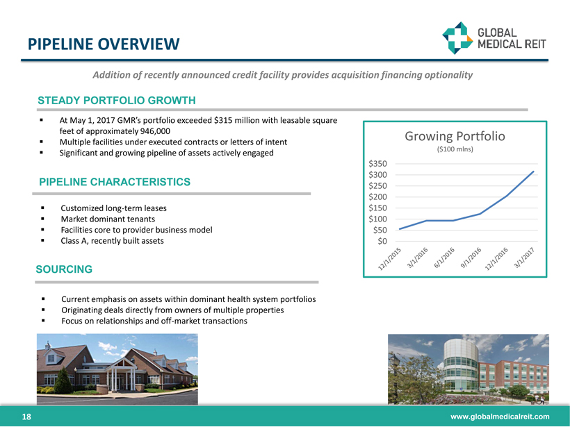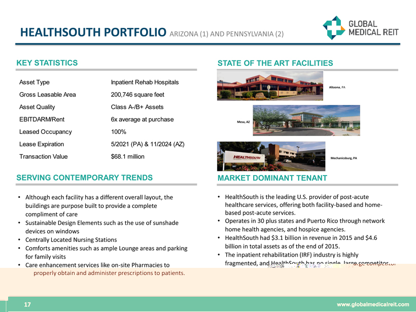 HEALTHSOUTH PORTFOLIO ARIZONA (1) AND PENNSYLVANIA (2) KEY STATISTICS Asset Type Inpatient Rehab Hospitals Gross Leasable Area 200,746 square feet Asset Quality Class A-/B+ Assets EBITDARM/Rent 6x average at purchase Leased Occupancy 100% Lease Expiration 5/2021 (PA) & 11/2024 (AZ) Transaction Value $68.1 million SERVING CONTEMPORARY TRENDS Although each facility has a different overall layout, the buildings are purpose built to provide a complete compliment of care Sustainable Design Elements such as the use of sunshade devices on windows Centrally Located Nursing Stations Comforts amenities such as ample Lounge areas and parking for family visits Care enhancement services like on-site Pharmacies to properly obtain and administer prescriptions to patients. STATE OF THE ART FACILITIS Altoona, PA Mesa, AZ Mechanicsburg, PA MARKET DOMINANT TENANT HealthSouth is the leading U.S. provider of post-acute healthcare services, offering both facility-based and home-based post-acute services. Operates in 30 plus states and Puerto Rico through network home health agencies, and hospice agencies. HealthSouth had $3.1 billion in revenue in 2015 and $4.6 billion in total assets as of the end of 2015. The inpatient rehabilitation (IRF) industry is highly fragmented, and HealthSouth has no single, large competitor 17 www.globalmedicalreit.com