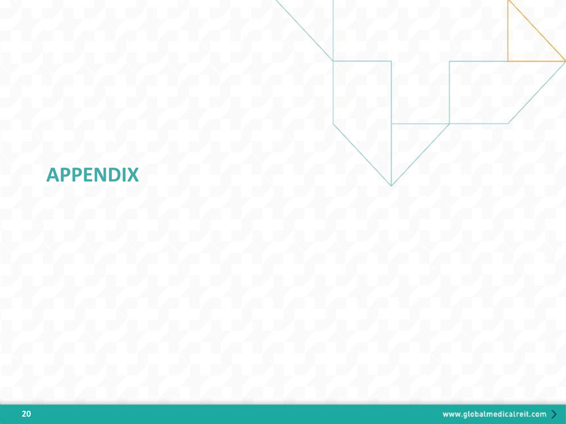 INVESTMENT HIGHLIGHTS State-of-the-Art Healthcare Facilities Management Team with Public REIT Experience Attractive Industry Trends High Quality Initial Portfolio Market Dominant Tenants Substantial Pipeline of High Quality Assets 19 www.globalmedicalreit.com