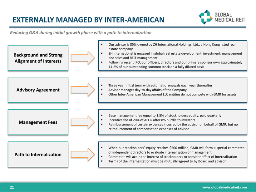 EXTERNALLY MANAGED BY INTER-AMERICAN Reducing G&A during initial growth phase with a path to internalization Background and Strong Alignment of Interests Advisory Agreement Management Fees Path to Internalization Our advisor is 85% owned by ZH International Holdings, Ltd., a Hong Kong listed real estate company ZH International is engaged in global real estate development, investment, management and sales and REIT management Following recent IPO, our officers, directors and our primary sponsor own approximately 14.2% of our outstanding common stock on a fully diluted basis Three year initial term with automatic renewals each year thereafter Advisor manages day-to-day affairs of the Company Other Inter-American Management LLC entities do not compete with GMR for assets Base management fee equal to 1.5% of stockholders equity, paid quarterly Incentive fee of 20% of AFFO after 8% hurdle to investors Reimbursement of certain expenses incurred by the advisor on behalf of GMR, but no reimbursement of compensation expenses of advisor When our stockholders’ equity reaches $500 million, GMR will form a special committee of independent directors to evaluate internalization of management Committee will act in the interest of stockholders to consider effect of internalization Terms of the internalization must be mutually agreed to by Board and advisor 21 www.globalmedicalreit.com