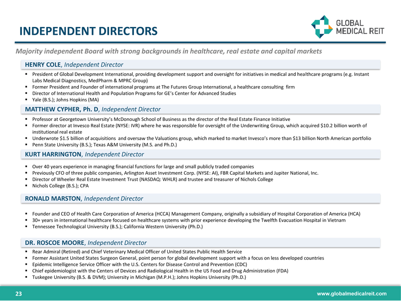 INDEPENDENT DIRECTORS Majority independent Board with strong backgrounds in healthcare, real estate and capital markets HENRY COLE, Independent Director President of Global Development International, providing development support and oversight for initiatives in medical and healthcare programs (e.g. Instant Labs Medical Diagnostics, MedPharm & MPRC Group) Former President and Founder of international programs at The Futures Group International, a healthcare consulting firm Director of International Health and Population Programs for GE’s Center for Advanced Studies Yale (B.S.); Johns Hopkins (MA) MATTHEW CYPHER, Ph. D, Independent Director Professor at Georgetown University’s McDonough School of Business as the director of the Real Estate Finance Initiative Former director at Invesco Real Estate (NYSE: IVR) where he was responsible for oversight of the Underwriting Group, which acquired $10.2 billion worth of institutional real estate Underwrote $1.5 billion of acquisitions and oversaw the Valuations group, which marked to market Invesco’s more than $13 billion North American portfolio Penn State University (B.S.); Texas A&M University (M.S. and Ph.D.) KURT HARRINGTON, Independent Director Over 40 years experience in managing financial functions for large and small publicly traded companies Previously CFO of three public companies, Arlington Asset Investment Corp. (NYSE: AI), FBR Capital Markets and Jupiter National, Inc. Director of Wheeler Real Estate Investment Trust (NASDAQ: WHLR) and trustee and treasurer of Nichols College Nichols College (B.S.); CPA RONALD MARSTON, Independent Director Founder and CEO of Health Care Corporation of America (HCCA) Management Company, originally a subsidiary of Hospital Corporation of America (HCA) 30+ years in international healthcare focused on healthcare systems with prior experience developing the Twelfth Evacuation Hospital in Vietnam Tennessee Technological University (B.S.); California Western University (Ph.D.) DR. ROSCOE MOORE, Independent Director Rear Admiral (Retired) and Chief Veterinary Medical Officer of United States Public Health Service Former Assistant United States Surgeon General, point person for global development support with a focus on less developed countries Epidemic Intelligence Service Officer with the U.S. Centers for Disease Control and Prevention (CDC) Chief epidemiologist with the Centers of Devices and Radiological Health in the US Food and Drug Administration (FDA) Tuskegee University (B.S. & DVM); University in Michigan (M.P.H.); Johns Hopkins University (Ph.D.) 23 www.globalmedicalreit.com