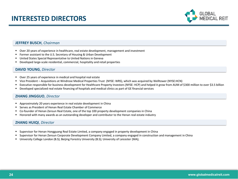 INTERESTED DIRECTORS JEFFREY BUSCH, Chairman Over 20 years of experience in healthcare, real estate development, management and investment Former assistant to the U.S. Secretary of Housing & Urban Development United States Special Representative to United Nations in Geneva Developed large-scale residential, commercial, hospitality and retail properties DAVID YOUNG, Director Over 25 years of experience in medical and hospital real estate Vice President – Acquisitions at Windrose Medical Properties Trust (NYSE: WRS), which was acquired by Welltower (NYSE:HCN) Executive responsible for business development for Healthcare Property Investors (NYSE: HCP) and helped it grow from AUM of $300 million to over $3.5 billion Developed specialized real estate financing of hospitals and medical clinics as part of GE financial services ZHANG JINGGUO, Director Approximately 20 years experience in real estate development in China Serves as President of Henan Real Estate Chamber of Commerce Co-founder of Henan Zensun Real Estate, one of the top 100 property development companies in China Honored with many awards as an outstanding developer and contributor to the Henan real estate industry ZHANG HUIQI, Director Supervisor for Henan Hongguang Real Estate Limited, a company engaged in property development in China Supervisor for Henan Zensun Corporate Development Company Limited, a company engaged in construction and management in China University College London (B.S); Beijing Forestry University (B.S); University of Leicester (MA); 24 www.globalmedicalreit.com