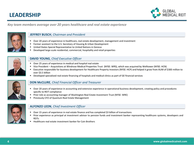 AT A GLANCE STOCK INFORMATION * GMRE (NYSE) STOCK PRICE: $9.29 Market Capitalization: $164 million Common shares outstanding: 17.6 million KEY BUSINESS POINTS Healthcare REIT focused on the acquisition and leasing of state-of-the-art, purpose built healthcare facilities Substantial pipeline of high quality assets Experienced management Attractive industry tailwinds BALANCE SHEET HIGHLIGHTS Well positioned to execute on pipeline acquisitions using recently-announced credit facility Addition of recently announced credit facility provides acquisition financing optionality * Data is as of May 31, 2017 3 www.globalmedicalreit.com