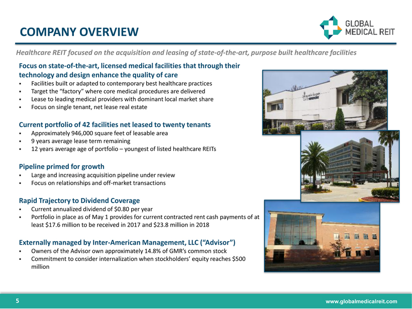 LEADERSHIP Key team members average over 20 years healthcare and real estate experience JEFFREY BUSCH, Chairman and President Over 20 years of experience in healthcare, real estate development, management and investment Former assistant to the U.S. Secretary of Housing & Urban Development United States Special Representative to United Nations in Geneva Developed large-scale residential, commercial, hospitality and retail properties DAVID YOUNG, Chief Executive Officer Over 25 years of experience in medical and hospital real estate Vice President – Acquisitions at Windrose Medical Properties Trust (NYSE: WRS), which was acquired by Welltower (NYSE: HCN) Executive responsible for business development for Healthcare Property Investors (NYSE: HCP) and helped it grow from AUM of $300 million to over $3.5 billion Developed specialized real estate financing of hospitals and medical clinics as part of GE financial services DON McCLURE, Chief Financial Officer and Treasurer Over 20 years of experience in accounting and extensive experience in operational business development, creating policy and procedures specific to REIT compliance Prior role as accounting manager of Washington Real Estate Investment Trust (NYSE: WRE) Previously CFO of Quantum Real Estate Management ALFONZO LEON, Chief Investment Officer Over 15 years of experience in real estate finance and has completed $3 billion of transactions Prior experience as principal at investment advisor to pension funds and investment banker representing healthcare systems, developers and REITs Healthcare real estate investment banker for Cain Brothers 4 www.globalmedicalreit.com