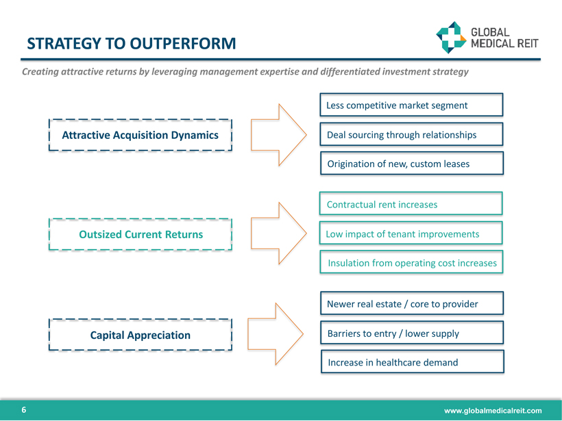 Pipeline primed for growth Large and increasing acquisition pipeline under review Focus on relationships and off-market transactions Rapid Trajectory to Dividend Coverage Current annualized dividend of $0.80 per year Portfolio in place as of May 1 provides for current contracted rent cash payments of at least $17.6 million to be received in 2017 and $23.8 million in 2018 Externally managed by Inter-American Management, LLC (“Advisor”) Owners of the Advisor own approximately 14.8% of GMR’s common stock Commitment to consider internalization when stockholders’ equity reaches $500 million 5 www.globalmedicalreit.com
