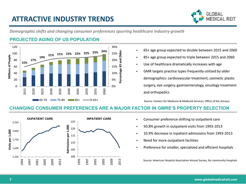 STRATEGY TO OUTPERFORM Creating attractive returns by leveraging management expertise and differentiated investment strategy Attractive Acquisition Dynamics Outsized Current Returns Capital Appreciation Less competitive market segment Deal sourcing through relationships Origination of new, custom leases Contractual rent increases Low impact of tenant improvements Insulation from operating cost increases Newer real estate / core to provider Barriers to entry / lower supply Increase in healthcare demand 6 www.globalmedicalreit.com