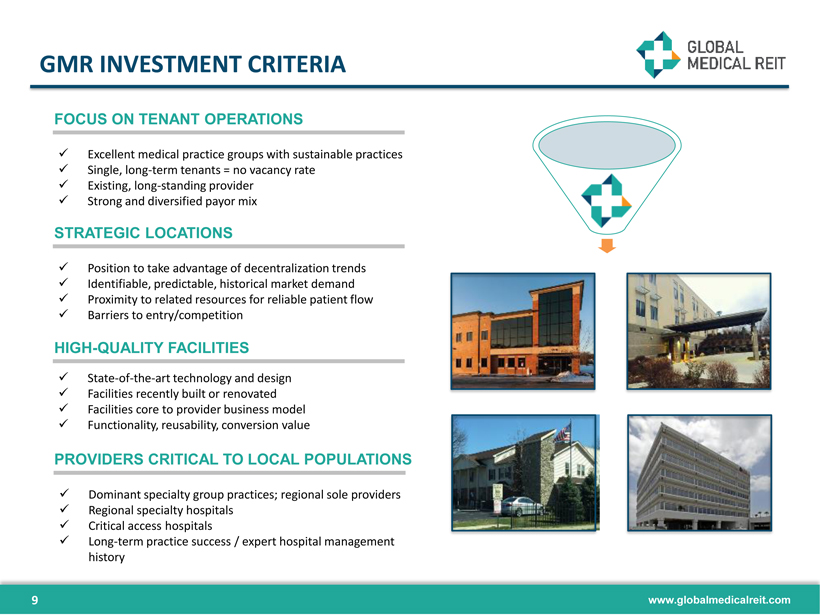EVIDENCE-BASED DESIGN As EBD research becomes more widely recognized and reproduced, facilities with these features expect to outperform EBD research demonstrates an interrelatedness between the design of a healthcare facility and patient outcomes Certain design elements have an important impact on productivity, safety, health and morale for both physicians and patients Facilities with these features can attract and retain strong tenants and will outperform over time STATE-OF-THE-ART EFFICIENT TREATMENT MEDICAL AND PROCESSING TECHNOLOGY DESIGN BETTER PATIENT OUTCOMES AMENITIZED ADVANCED BUILDING PATIENT ENGINEERING ENVIRONMENT 8 www.globalmedicalreit.com