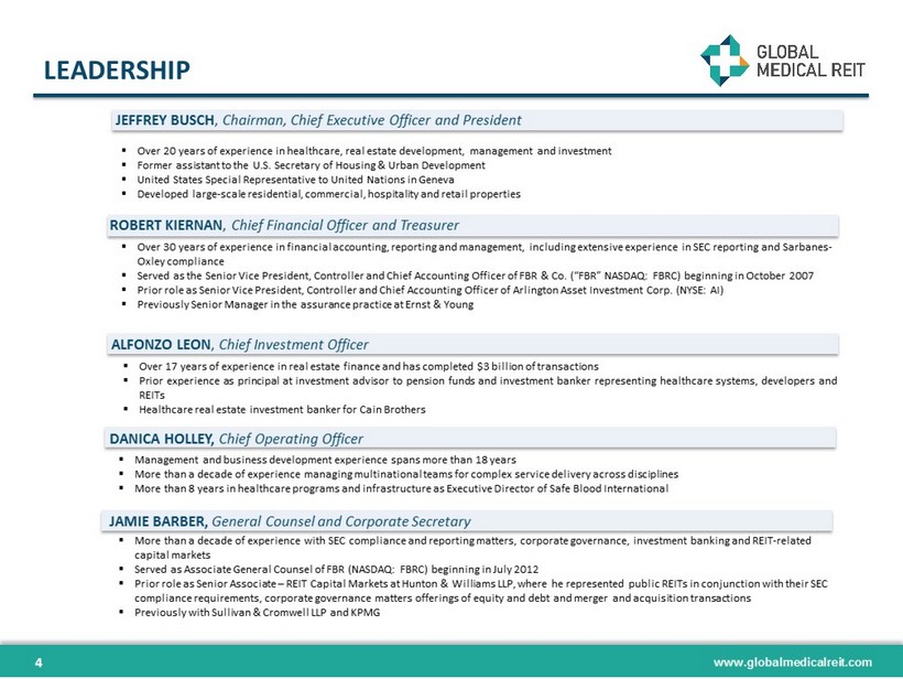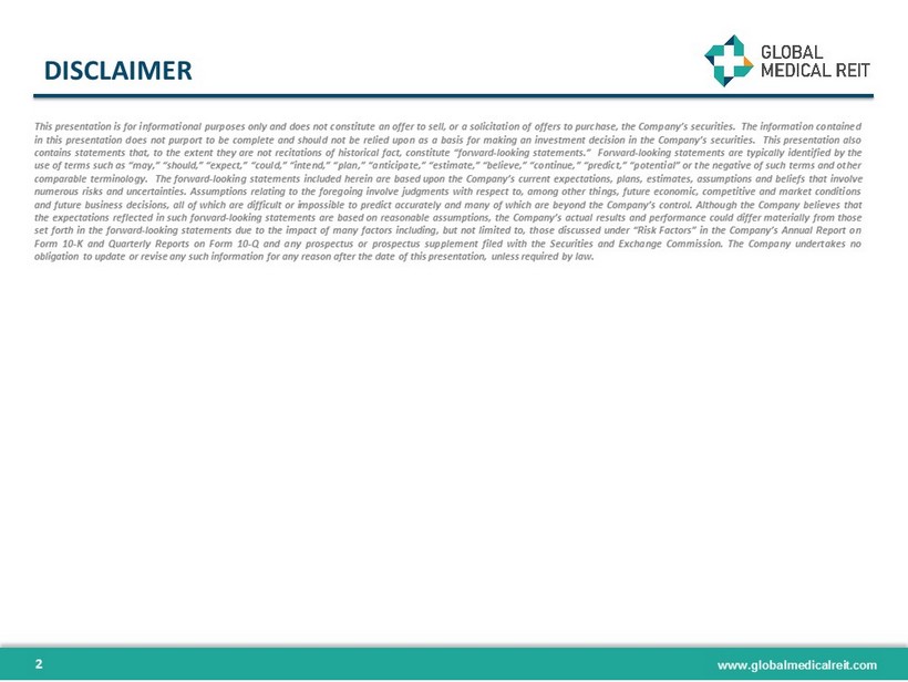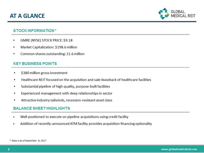 www.globalmedicalreit.com DISCLAIMER 2 This presentation is for informational purposes only and does not constitute an offer to sell, or a solicitation of offers to purchase, the Company’s securities . The information contained in this presentation does not purport to be complete and should not be relied upon as a basis for making an investment decision in the Company’s securities . This presentation also contains statements that, to the extent they are not recitations of historical fact, constitute “forward - looking statements . ” Forward - looking statements are typically identified by the use of terms such as “may,” “should,” “expect,” “could,” “intend,” “plan,” “anticipate,” “estimate,” “believe,” “continue,” “predict,” “potential” or the negative of such terms and other comparable terminology . The forward - looking statements included herein are based upon the Company’s current expectations, plans, estimates, assumptions and beliefs that involve numerous risks and uncertainties . Assumptions relating to the foregoing involve judgments with respect to, among other things, future economic, competitive and market conditions and future business decisions, all of which are difficult or impossible to predict accurately and many of which are beyond the Company’s control . Although the Company believes that the expectations reflected in such forward - looking statements are based on reasonable assumptions, the Company’s actual results and performance could differ materially from those set forth in the forward - looking statements due to the impact of many factors including, but not limited to, those discussed under “Risk Factors” in the Company’s Annual Report on Form 10 - K and Quarterly Reports on Form 10 - Q and any prospectus or prospectus supplement filed with the Securities and Exchange Commission . The Company undertakes no obligation to update or revise any such information for any reason after the date of this presentation, unless required by law .