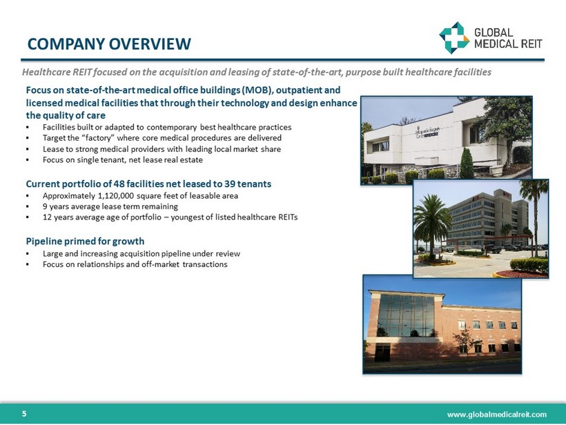 www.globalmedicalreit.com JAMIE BARBER, General Counsel and Corporate Secretary LEADERSHIP 4 ▪ Over 30 years of experience in financial accounting, reporting and management, including extensive experience in SEC reportin g a nd Sarbanes - Oxley compliance ▪ Served as the Senior Vice President, Controller and Chief Accounting Officer of FBR & Co. (“FBR” NASDAQ: FBRC) beginning in O cto ber 2007 ▪ Prior role as Senior Vice President, Controller and Chief Accounting Officer of Arlington Asset Investment Corp. (NYSE: AI) ▪ Previously Senior Manager in the assurance practice at Ernst & Young ▪ Over 17 years of experience in real estate finance and has completed $ 3 billion of transactions ▪ Prior experience as principal at investment advisor to pension funds and investment banker representing healthcare systems, developers and REITs ▪ Healthcare real estate investment banker for Cain Brothers DANICA HOLLEY, Chief Operating Officer ALFONZO LEON , Chief Investment Officer ▪ Over 20 years of experience in healthcare, real estate development, management and investment ▪ Former assistant to the U.S. Secretary of Housing & Urban Development ▪ United States Special Representative to United Nations in Geneva ▪ Developed large - scale residential, commercial, hospitality and retail properties ▪ More than a decade of experience with SEC compliance and reporting matters, corporate governance, investment banking and REIT - re lated capital markets ▪ Served as Associate General Counsel of FBR (NASDAQ: FBRC) beginning in July 2012 ▪ Prior role as Senior Associate – REIT Capital Markets at Hunton & Williams LLP, where he represented public REITs in conjunction with their SEC compliance requirements, corporate governance matters offerings of equity and debt and merger and acquisition transactions ▪ Previously with Sullivan & Cromwell LLP and KPMG ▪ Management and business development experience spans more than 18 years ▪ More than a decade of experience managing multinational teams for complex service delivery across disciplines ▪ More than 8 years in healthcare programs and infrastructure as Executive Director of Safe Blood International ROBERT KIERNAN , Chief Financial Officer and Treasurer JEFFREY BUSCH , Chairman, Chief Executive Officer and President