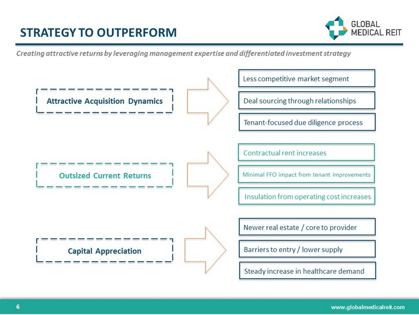 www.globalmedicalreit.com COMPANY OVERVIEW 5 Healthcare REIT focused on the acquisition and leasing of state - of - the - art, purpose built healthcare facilities Focus on state - of - the - art medical office buildings (MOB), outpatient and licensed medical facilities that through their technology and design enhance the quality of care ▪ Facilities built or adapted to contemporary best healthcare practices ▪ Target the “factory” where core medical procedures are delivered ▪ Lease to strong medical providers with leading local market share ▪ Focus on single tenant, net lease real estate Current portfolio of 48 facilities net leased to 39 tenants ▪ Approximately 1,120,000 square feet of leasable area ▪ 9 years average lease term remaining ▪ 12 years average age of portfolio – youngest of listed healthcare REITs Pipeline primed for growth ▪ Large and increasing acquisition pipeline under review ▪ Focus on relationships and off - market transactions