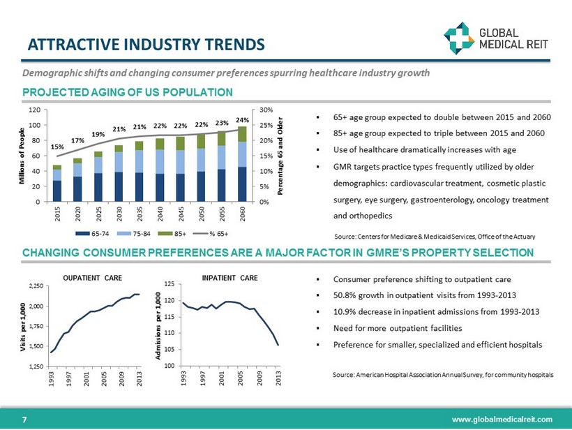 www.globalmedicalreit.com STRATEGY TO OUTPERFORM 6 Creating attractive returns by leveraging management expertise and differentiated investment strategy Attractive Acquisition Dynamics Outsized Current Returns Capital Appreciation Less competitive market segment Deal sourcing through relationships Tenant - focused due diligence process Contractual rent increases Minimal FFO impact from tenant improvements Insulation from operating cost increases Newer real estate / core to provider Barriers to entry / lower supply Steady increase in healthcare demand