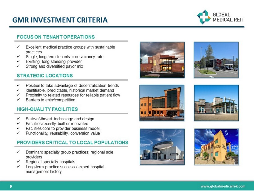 www.globalmedicalreit.com EVIDENCE - BASED DESIGN 8 As EBD research becomes more widely recognized and reproduced, facilities with these features expect to outperform STATE - OF - THE - ART MEDICAL TECHNOLOGY ADVANCED BUILDING ENGINEERING EFFICIENT TREATMENT AND PROCESSING DESIGN AMENITIZED PATIENT ENVIRONMENT ▪ EBD research demonstrates an interrelatedness between the design of a healthcare facility and patient outcomes ▪ Certain design elements have an important impact on productivity, safety, health and morale for both physicians and patients ▪ Facilities with these features can attract and retain strong tenants and will outperform over time BETTER PATIENT OUTCOMES