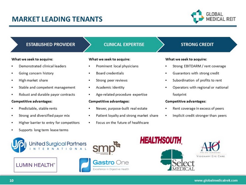 www.globalmedicalreit.com GMR INVESTMENT CRITERIA HIGH - QUALITY FACILITIES x State - of - the - art technology and design x Facilities recently built or renovated x Facilities core to provider business model x Functionality, reusability, conversion value FOCUS ON TENANT OPERATIONS x Excellent medical practice groups with sustainable practices x Single, long - term tenants = no vacancy rate x Existing, long - standing provider x Strong and diversified payor mix STRATEGIC LOCATIONS x Position to take advantage of decentralization trends x Identifiable, predictable, historical market demand x Proximity to related resources for reliable patient flow x Barriers to entry/competition x Dominant specialty group practices; regional sole providers x Regional specialty hospitals x Long - term practice success / expert hospital management history PROVIDERS CRITICAL TO LOCAL POPULATIONS 9