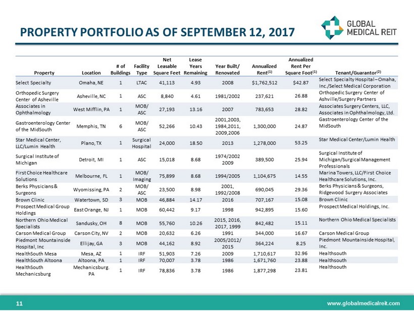 www.globalmedicalreit.com MARKET LEADING TENANTS ESTABLISHED PROVIDER CLINICAL EXPERTISE STRONG CREDIT 10 What we seek to acquire: ▪ Demonstrated clinical leaders ▪ Going concern history ▪ High market share ▪ Stable and competent management ▪ Robust and durable payor contracts Competitive advantages: ▪ Predictable, stable rents ▪ Strong and diversified payor mix ▪ Higher barrier to entry for competitors ▪ Supports long term lease terms What we seek to acquire: ▪ Prominent local physicians ▪ Board credentials ▪ Strong peer reviews ▪ Academic identity ▪ Age - related procedure expertise Competitive advantages: ▪ Newer, purpose - built real estate ▪ Patient loyalty and strong market share ▪ Focus on the future of healthcare What we seek to acquire: ▪ Strong EBITDARM / rent coverage ▪ Guarantors with strong credit ▪ Subordination of profits to rent ▪ Operators with regional or national footprint Competitive advantages: ▪ Rent coverage in excess of peers ▪ Implicit credit stronger than peers