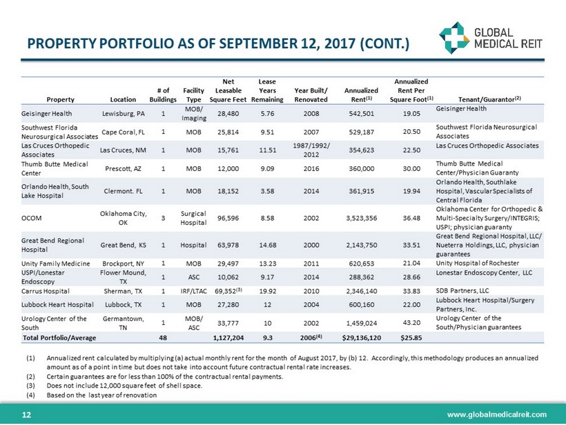 www.globalmedicalreit.com PROPERTY PORTFOLIO AS OF SEPTEMBER 12, 2017 ( CONT. ) Property Location # of Buildings Facility Type Net Leasable Square Feet Lease Years Remaining Year Built/ Renovated Annualized Rent (1) Annualized Rent Per Square Foot (1) Tenant/Guarantor (2) Geisinger Health Lewisburg, PA 1 MOB/ Imaging 28,480 5.76 2008 542,501 19.05 Geisinger Health Southwest Florida Neurosurgical Associates Cape Coral, FL 1 MOB 25,814 9.51 2007 529,187 20.50 Southwest Florida Neurosurgical Associates Las Cruces Orthopedic Associates Las Cruces, NM 1 MOB 15,761 11.51 1987/1992/ 2012 354,623 22.50 Las Cruces Orthopedic Associates Thumb Butte Medical Center Prescott, AZ 1 MOB 12,000 9.09 2016 360,000 30.00 Thumb Butte Medical Center/Physician Guaranty Orlando Health, South Lake Hospital Clermont. FL 1 MOB 18,152 3.58 2014 361,915 19.94 Orlando Health, Southlake Hospital, Vascular Specialists of Central Florida OCOM Oklahoma City, OK 3 Surgical Hospital 96,596 8.58 2002 3,523,356 36.48 Oklahoma Center for Orthopedic & Multi - Specialty Surgery/INTEGRIS; USPI; physician guaranty Great Bend Regional Hospital Great Bend, KS 1 Hospital 63,978 14.68 2000 2,143,750 33.51 Great Bend Regional Hospital, LLC/ Nueterra Holdings, LLC, physician guarantees Unity Family Medicine Brockport, NY 1 MOB 29,497 13.23 2011 620,653 21.04 Unity Hospital of Rochester USPI/Lonestar Endoscopy Flower Mound, TX 1 ASC 10,062 9.17 2014 288,362 28.66 Lonestar Endoscopy Center, LLC Carrus Hospital Sherman, TX 1 IRF/LTAC 69,352 (3) 19.92 2010 2,346,140 33.83 SDB Partners, LLC Lubbock Heart Hospital Lubbock, TX 1 MOB 27,280 12 2004 600,160 22.00 Lubbock Heart Hospital/Surgery Partners, Inc. Urology Center of the South Germantown, TN 1 MOB/ ASC 33,777 10 2002 1,459,024 43.20 Urology Center of the South/Physician guarantees Total Portfolio/Average 48 1,127,204 9.3 2006 (4) $29,136,120 $25.85 (1) Annualized rent calculated by multiplying (a) actual monthly rent for the month of August 2017, by (b) 12. Accordingly, this methodology produces an annualized amount as of a point in time but does not take into account future contractual rental rate increases. (2) Certain guarantees are for less than 100% of the contractual rental payments. (3) Does not include 12,000 square feet of shell space. (4) Based on the last year of renovation 12