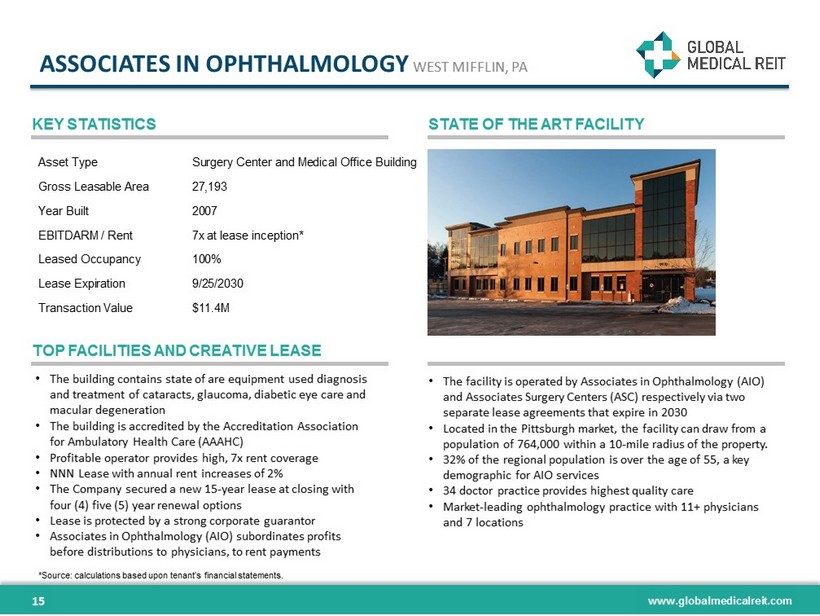 www.globalmedicalreit.com ASSOCIATES IN OPHTHALMOLOGY WEST MIFFLIN, PA KEY STATISTICS STATE OF THE ART FACILITY TOP FACILITIES AND CREATIVE LEASE • The building contains state of are equipment used diagnosis and treatment of cataracts, glaucoma, diabetic eye care and macular degeneration • The building is accredited by the Accreditation Association for Ambulatory Health Care (AAAHC) • Profitable operator provides high, 7x rent coverage • NNN Lease with annual rent increases of 2% • The Company secured a new 15 - year lease at closing with four (4) five (5) year renewal options • Lease is protected by a strong corporate guarantor • Associates in Ophthalmology (AIO) subordinates profits before distributions to physicians, to rent payments • The facility is operated by Associates in Ophthalmology (AIO) and Associates Surgery Centers (ASC) respectively via two separate lease agreements that expire in 2030 • Located in the Pittsburgh market, the facility can draw from a population of 764,000 within a 10 - mile radius of the property. • 32% of the regional population is over the age of 55, a key demographic for AIO services • 34 doctor practice provides highest quality care • Market - leading ophthalmology practice with 11+ physicians and 7 locations Asset Type Surgery Center and Medical Office Building Gross Leasable Area 27,193 Year Built 2007 EBITDARM / Rent 7x at lease inception* Leased Occupancy 100% Lease Expiration 9/25/2030 Transaction Value $11.4M *Source: calculations based upon tenant’s financial statements. 15