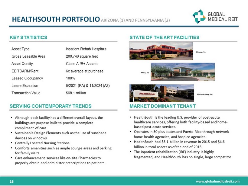 www.globalmedicalreit.com • Although each facility has a different overall layout, the buildings are purpose built to provide a complete compliment of care • Sustainable Design Elements such as the use of sunshade devices on windows • Centrally Located Nursing Stations • Comforts amenities such as ample Lounge areas and parking for family visits • Care enhancement services like on - site Pharmacies to properly obtain and administer prescriptions to patients. HEALTHSOUTH PORTFOLIO ARIZONA (1) AND PENNSYLVANIA (2) KEY STATISTICS STATE OF THE ART FACILITIES SERVING CONTEMPORARY TRENDS MARKET DOMINANT TENANT • HealthSouth is the leading U.S. provider of post - acute healthcare services, offering both facility - based and home - based post - acute services. • Operates in 30 plus states and Puerto Rico through network home health agencies, and hospice agencies. • HealthSouth had $3.1 billion in revenue in 2015 and $4.6 billion in total assets as of the end of 2015. • The inpatient rehabilitation (IRF) industry is highly fragmented, and HealthSouth has no single, large competitor 16 Asset Type Inpatient Rehab Hospitals Gross Leasable Area 200,746 square feet Asset Quality Class A-/B+ Assets EBITDARM/Rent 6x average at purchase Leased Occupancy 100% Lease Expiration 5/2021 (PA) & 11/2024 (AZ) Transaction Value $68.1 million Altoona , PA Mechanicsburg, PA Mesa, AZ