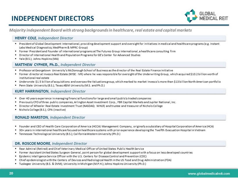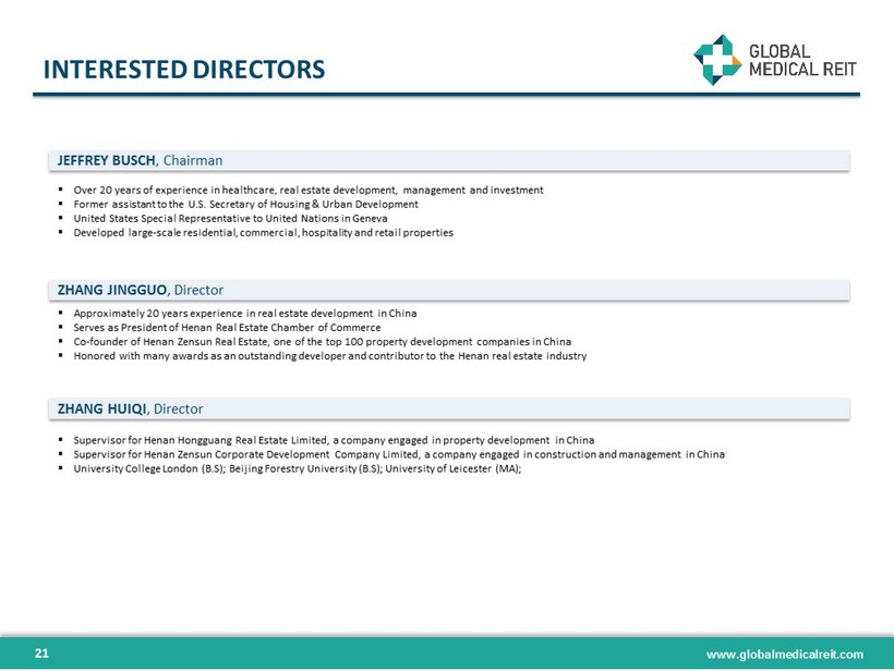 www.globalmedicalreit.com INDEPENDENT DIRECTORS ▪ President of Global Development International, providing development support and oversight for initiatives in medical and hea lth care programs (e.g. Instant Labs Medical Diagnostics, MedPharm & MPRC Group) ▪ Former President and Founder of international programs at The Futures Group International, a healthcare consulting firm ▪ Director of International Health and Population Programs for GE’s Center for Advanced Studies ▪ Yale (B.S.); Johns Hopkins (MA) ▪ Professor at Georgetown University’s McDonough School of Business as the director of the Real Estate Finance Initiative ▪ Former director at Invesco Real Estate (NYSE: IVR) where he was responsible for oversight of the Underwriting Group, which ac qui red $10.2 billion worth of institutional real estate ▪ Underwrote $1.5 billion of acquisitions and oversaw the Valuations group, which marked to market Invesco’s more than $13 bil lio n North American portfolio ▪ Penn State University (B.S.); Texas A&M University (M.S. and Ph.D.) ▪ Over 40 years experience in managing financial functions for large and small publicly traded companies ▪ Previously CFO of three public companies, Arlington Asset Investment Corp . , FBR Capital Markets and Jupiter National, Inc . ▪ Director of Wheeler Real Estate Investment Trust (NASDAQ : WHLR) and trustee and treasurer of Nichols College ▪ Nichols College (B . S . ) ; CPA (inactive) ▪ Founder and CEO of Health Care Corporation of America (HCCA) Management Company, originally a subsidiary of Hospital Corporation of America (HCA) ▪ 30 + years in international healthcare focused on healthcare systems with prior experience developing the Twelfth Evacuation Hospital in Vietnam ▪ Tennessee Technological University (B . S . ) ; California Western University (Ph . D . ) HENRY COLE , Independent Director MATTHEW CYPHER, Ph.D. , Independent Director KURT HARRINGTON , Independent Director RONALD MARSTON , Independent Director ▪ Rear Admiral (Retired) and Chief Veterinary Medical Officer of United States Public Health Service ▪ Former Assistant United States Surgeon General, point person for global development support with a focus on less developed countries ▪ Epidemic Intelligence Service Officer with the U . S . Centers for Disease Control and Prevention (CDC) ▪ Chief epidemiologist with the Centers of Devices and Radiological Health in the US Food and Drug Administration (FDA) ▪ Tuskegee University (B . S . & DVM) ; University in Michigan (M . P . H . ) ; Johns Hopkins University (Ph . D . ) DR. ROSCOE MOORE , Independent Director Majority independent Board with strong backgrounds in healthcare, real estate and capital markets 20