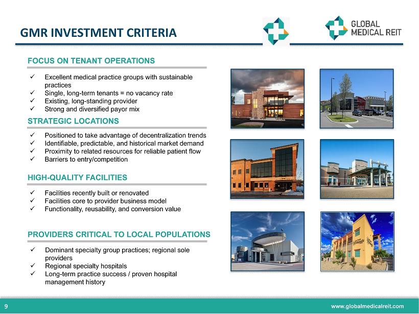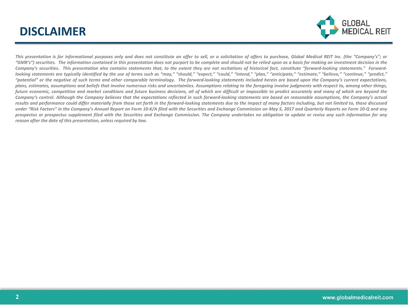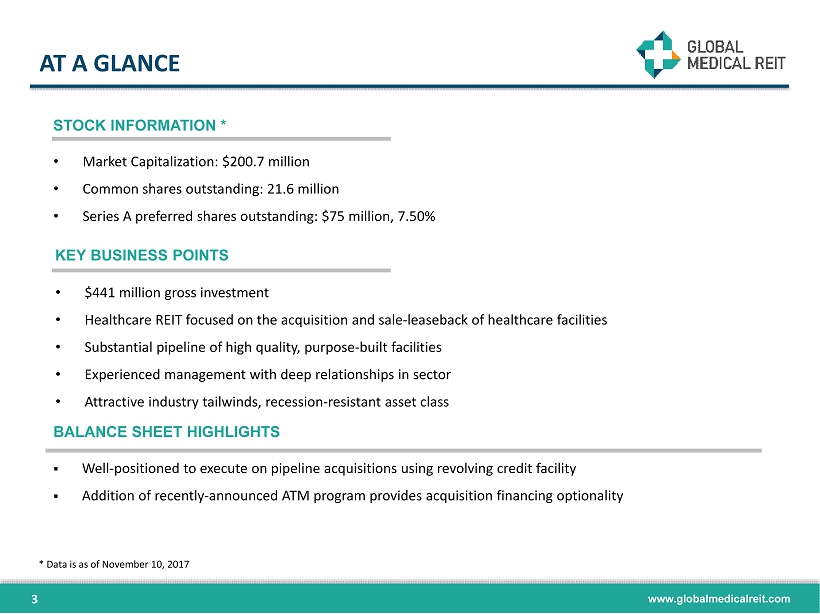 www.globalmedicalreit.com DISCLAIMER 2 This presentation is for informational purposes only and does not constitute an offer to sell, or a solicitation of offers to purchase, Global Medical REIT Inc . (the “Company’s” ; or “GMR’s”) securities . The information contained in this presentation does not purport to be complete and should not be relied upon as a basis for making an investment decision in the Company’s securities . This presentation also contains statements that, to the extent they are not recitations of historical fact, constitute “forward - looking statements . ” Forward - looking statements are typically identified by the use of terms such as “may,” “should,” “expect,” “could,” “intend,” “plan,” “anticipate,” “estimate,” “believe,” “continue,” “predict,” “potential” or the negative of such terms and other comparable terminology . The forward - looking statements included herein are based upon the Company’s current expectations, plans, estimates, assumptions and beliefs that involve numerous risks and uncertainties . Assumptions relating to the foregoing involve judgments with respect to, among other things, future economic, competitive and market conditions and future business decisions, all of which are difficult or impossible to predict accurately and many of which are beyond the Company’s control . Although the Company believes that the expectations reflected in such forward - looking statements are based on reasonable assumptions, the Company’s actual results and performance could differ materially from those set forth in the forward - looking statements due to the impact of many factors including, but not limited to, those discussed under “Risk Factors” in the Company’s Annual Report on Form 10 - K/A filed with the Securities and Exchange Commission on May 5 , 2017 and Quarterly Reports on Form 10 - Q and any prospectus or prospectus supplement filed with the Securities and Exchange Commission . The Company undertakes no obligation to update or revise any such information for any reason after the date of this presentation, unless required by law .