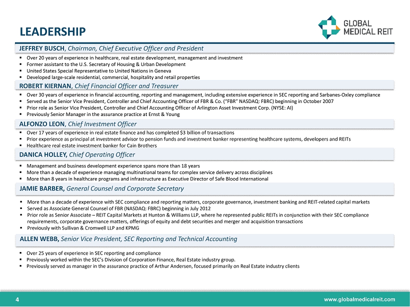 www.globalmedicalreit.com AT A GLANCE ▪ Well - positioned to execute on pipeline acquisitions using revolving credit facility ▪ Addition of recently - announced ATM program provides acquisition financing optionality STOCK INFORMATION * 3 BALANCE SHEET HIGHLIGHTS • Market Capitalization: $200.7 million • Common shares outstanding: 21.6 million • Series A preferred shares outstanding: $75 million, 7.50% * Data is as of November 10, 2017 KEY BUSINESS POINTS • $441 million gross investment • Healthcare REIT focused on the acquisition and sale - leaseback of healthcare facilities • Substantial pipeline of high quality, purpose - built facilities • Experienced management with deep relationships in sector • Attractive industry tailwinds, recession - resistant asset class